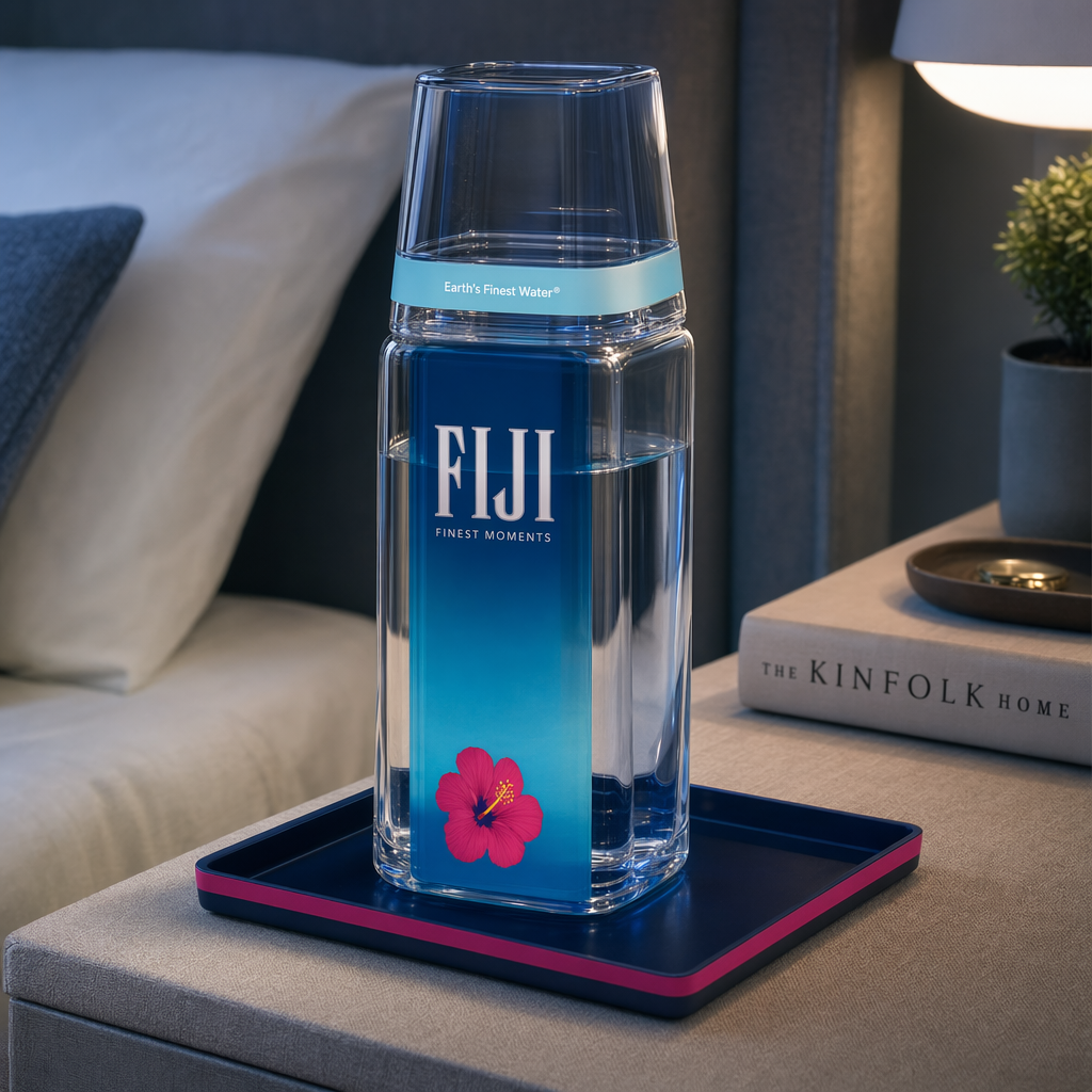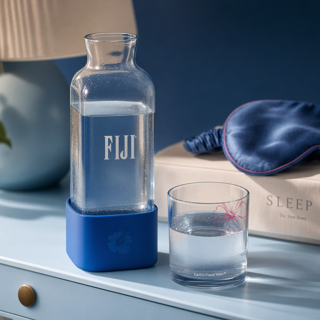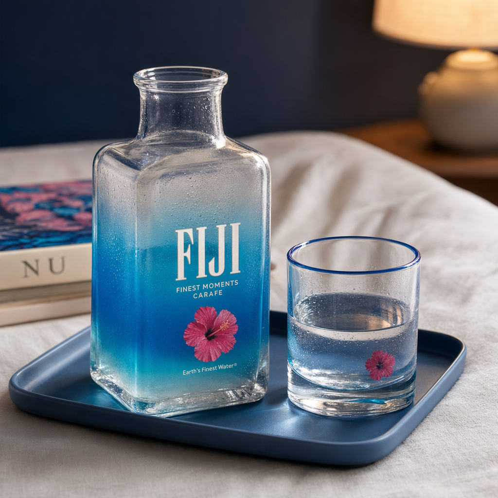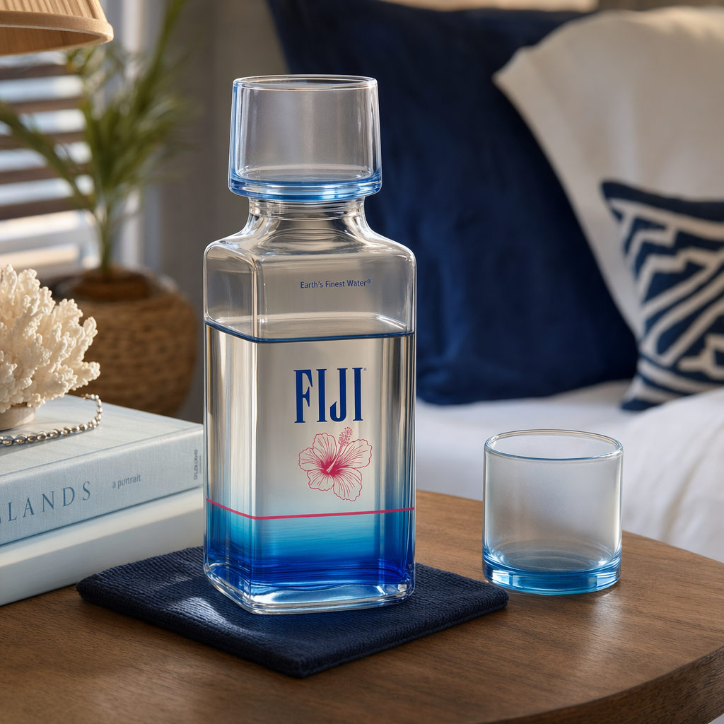 Photorealistic FIJI Water “finest moments” bedside carafe-and-glass set, designed as an affordable luxury ritual object for nightstands. A slim, square-shouldered glass carafe echoes the iconic FIJI bottle silhouette, made from thick, ultra-clear glass with a soft FIJI blue tint in the base and a satin-finished matching glass tumbler that nests on top as a lid. A minimal FIJI wordmark in primary FIJI blue (#003DA5) sits low on the carafe with a delicate magenta hibiscus line drawing and the phrase “Earth’s Finest Water®” in small, refined type near the rim. A subtle blue-to-bright-light-blue gradient band (#003DA5 to #00C1D5) wraps the lower third like a water horizon, with a thin magenta accent line breaking it, reinforcing the signature blue + magenta pairing. Lighting is warm, soft, and intimate, like a late-afternoon or early-evening bedroom: golden side light from a window or lamp casting gentle reflections through the glass onto a pale ice-blue (#BBDDE6) hardcover book and a navy (#041C2C) linen coaster. Background is a blurred, cozy bedroom vignette in navy and light neutrals, with a hint of a palm plant in soft focus to nod to Fiji’s island origin. Camera is a slightly above eye-level close-up of the carafe and glass on a wooden nightstand, emphasizing the clarity of the water and the relaxing, wellness-focused ritual of a nightly hydration moment, elevated but not ostentatious.