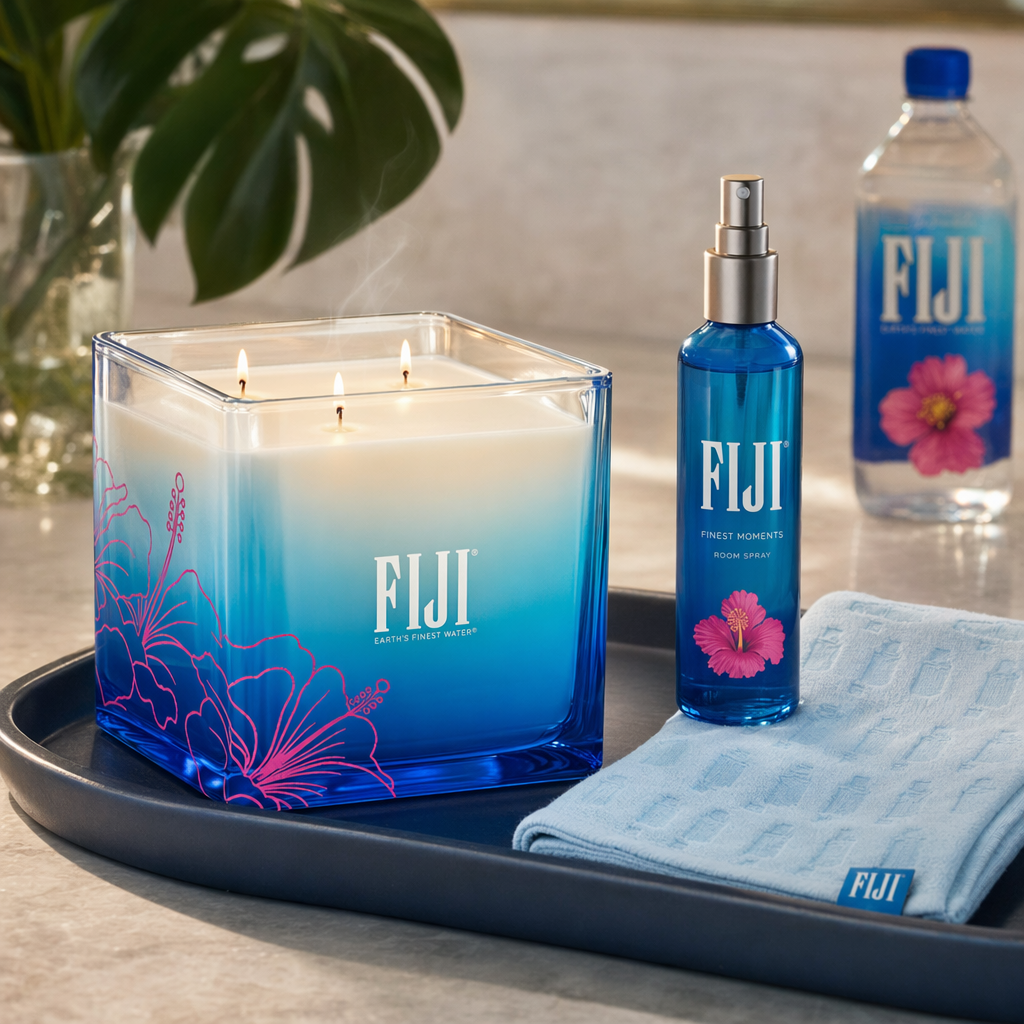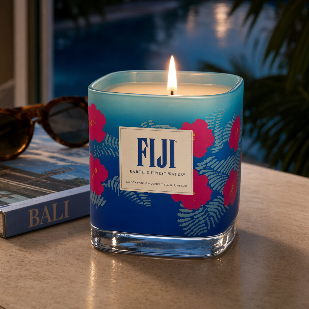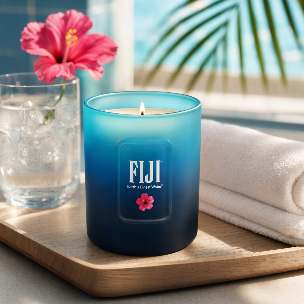 Photorealistic mockup of a FIJI Water “Finest Moments” relaxation candle designed as affordable luxury for an everyday wind-down ritual. The candle vessel is a heavy, matte glass with a subtly squared cylinder shape echoing the FIJI bottle’s square footprint, with softly radiused corners and a thick, clear base that catches the light like water. Primary color: rich FIJI blue (#003DA5) on the body, fading upward into bright light blue (#00C1D5) in a gentle vertical gradient. Around the vessel, a delicate, almost textile-like pattern of abstract hibiscus petals and water ripples in magenta (#E10098) and light blue (#BBDDE6) wraps softly, feeling fashion-forward rather than loud. On the front, a small, centered label in off-white with simple, confident typography: FIJI logo in blue, line below reading “Earth’s Finest Water®” and beneath that a smaller line like “Lagoon Evening – Coconut, Sea Salt, Hibiscus”. Wick is clean cotton, the wax a natural off-white, partially melted with a calm, steady flame. Background: close-up tabletop scene, shot at low angle, with the candle on a pale stone or light wood surface next to a neatly stacked travel book and a pair of relaxed, stylish sunglasses, slightly out of focus, hinting at a well-traveled, laid-back lifestyle. In the far background, soft bokeh of a dusky blue window suggesting twilight over water or a pool, with very soft reflections of palm fronds. Lighting: warm, intimate glow from the candle plus soft ambient cool-blue light from the side, balancing warmth (flame) and the FIJI blue environment, creating a cozy yet refreshing mood. Camera: tight hero shot, shallow depth of field, vessel sharply in focus, textures of matte glass and clear base rendered crisply, with subtle reflections on the table surface.