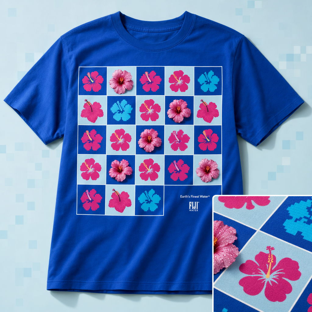 Photorealistic studio mockup of a unisex short-sleeve FIJI Water graphic T-shirt laid flat on a clean backdrop. The tee is a rich FIJI primary blue (#003DA5) cotton with a soft, slightly lustrous premium jersey finish. On the front, a full-bleed checkerboard grid fills the torso area: alternating squares in FIJI blue and light ice blue (#BBDDE6). In each colored square sits a single hibiscus icon, but with mixed-media treatments: some are flat magenta (#E10098) vector hibiscus outlines, some are clearly pixelated 8-bit hibiscus motifs in bright cyan (#00C1D5) and magenta, and some are small, high-resolution photo-real hibiscus blooms with depth, shadows, and water droplets, creating a playful digital-meets-real texture. The grid is precise and balanced, with thin white keylines separating squares for clarity. At the lower right corner of the grid, in small, clean white sans-serif type, sits the line: “Earth’s Finest Water®” and a subtle tiny FIJI logo lockup, integrated but not overpowering the art. Lighting is soft, diffused daylight from the top left, emphasizing the fabric’s quality and ink detail with gentle shadows. Background is a minimal light blue (#BBDDE6) sweep with a faint, out-of-focus pixel grid pattern echoing the shirt design, keeping focus on the garment while reinforcing the Gen Z, digital aesthetic. Camera is top-down, slightly offset, showing the whole tee, with a close-up inset crop of the chest graphic in the corner of the frame to highlight the contrast between vector, pixel, and photo-real hibiscus treatments.