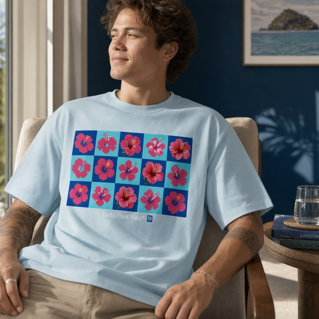 Photorealistic lifestyle mockup of a FIJI Water “Hibiscus Pixel Grid Tee” worn in a relaxed, sunlit setting. The unisex tee is a slightly oversized, boxy fit in soft light blue (#BBDDE6) cotton, draping naturally on a casually styled model leaning back on a linen lounge chair near a sunny window, evoking everyday escape and relaxation. Across the chest is a wide, rectangular checkerboard panel: a 6x4 grid of squares that alternate between deep FIJI blue (#003DA5) and bright light blue (#00C1D5). Inside each square is one hibiscus rendered in a different visual language: flat, crisp magenta (#E10098) vector icons; chunky pixel art hibiscus made of visible square pixels; and small, sharply detailed photographic hibiscus blooms with natural highlights, giving a mosaic of digital-to-real transitions. The overall color story leans heavily into FIJI blue + magenta as the hero pairing. Centered just below the grid in small, confident white type is the tagline “Earth’s Finest Water®” with a tiny square FIJI icon, grounding the design in the brand. The scene is lit with warm, late-afternoon natural light, casting soft shadows and subtle sun streaks across the tee, enhancing texture and ink vibrancy. Background includes hints of a calm interior—pale navy wall (#041C2C) in soft blur, a glass of water on a side table—keeping the mood laid-back, premium, and personal. Camera is a medium shot from waist up, slightly angled, clearly capturing the full graphic while also showing the relaxed, aspirational lifestyle context.