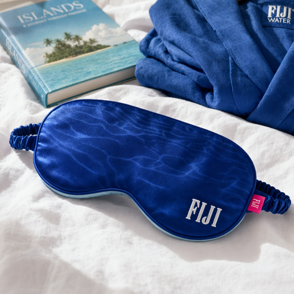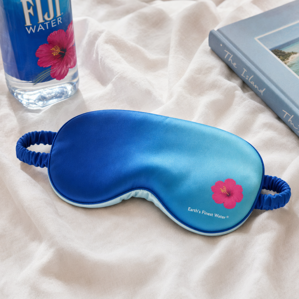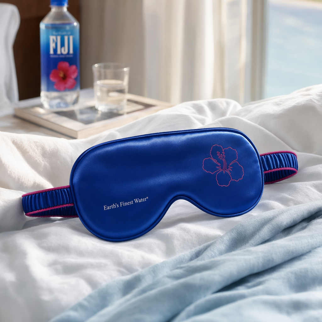 Photorealistic product shot of a FIJI Water branded silky eye mask laid flat on a soft bedscape, designed as an affordable-luxury nightly ritual piece. The mask body is made from smooth, lustrous satin in a rich FIJI primary blue (#003DA5) with a gentle, pillowy thickness. Across one side, in small, refined white type, the line “Earth’s Finest Water®” is printed, paired with a subtle magenta (#E10098) hibiscus outline near the temple area—no large logos or loud branding, just a chic FIJI signature. The elastic strap is wrapped in matching satin, with a thin magenta edge piping that creates the iconic blue + magenta pairing without feeling flashy. In the background, shoot on an unmade bed with crisp white linen sheets and a light blue (#BBDDE6) throw, softly wrinkled to feel lived-in and relaxed. Add a FIJI bottle casually placed out of focus in the background on a nightstand with a book and a small glass of water, hinting at a wind-down ritual. Lighting is soft, natural morning or late-afternoon light coming from a side window, with gentle shadows and a calm, airy mood. Camera angle is a close-up, slightly above the mask, shallow depth of field, emphasizing the satin sheen and premium stitching. No clutter, no tech, no sports cues—just serene, effortless, well-traveled hotel-at-home energy.