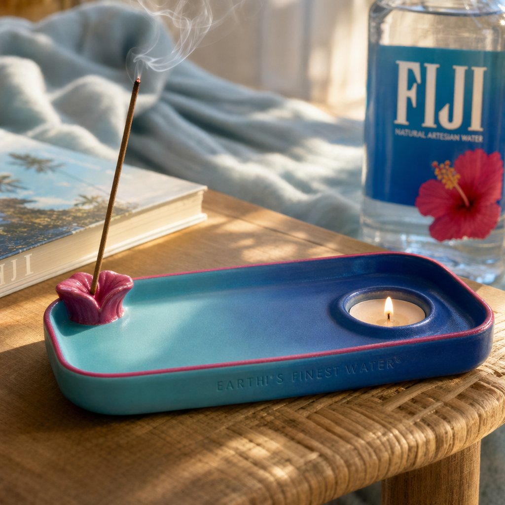 Photorealistic scene of a FIJI Water “Finest Moments” ceramic incense holder and matching tealight tray set, designed for a simple at-home escape ritual. The main object is a low, rectangular tray with softly rounded, square-inspired corners, echoing the iconic FIJI bottle shape. Material is matte-glazed ceramic in a gradient from FIJI electric light blue (#00C1D5) at one end into deeper FIJI blue (#003DA5) at the other, with a thin, hand-painted magenta (#E10098) rim all around for the signature blue + magenta pairing. At one corner, a small, integrated upright incense-stick holder shaped like a minimal hibiscus petal in glossy magenta glaze; at the opposite corner, a shallow circular well sized for a tealight candle. Subtle, tone-on-tone “Earth’s Finest Water®” debossed along one side of the tray, barely visible unless light hits at an angle—premium, not shouty branding. Style the scene on a light wood side table or rattan surface next to a softly rumpled pale blue throw and a closed book, with a FIJI bottle in the background and a single stick of incense lit, faint, delicate smoke curling upward. Lighting is warm golden-hour window light with gentle, long shadows, evoking relaxation and escape rather than party or performance. Camera is a 3/4 close-up from a low angle to show the tray’s thickness, ceramic texture, and gentle gradient, with shallow depth of field so background elements are softly blurred. Overall vibe: calm, playful, well-traveled spa-at-home, clearly something only FIJI would make through its island, hibiscus, and square-form cues.