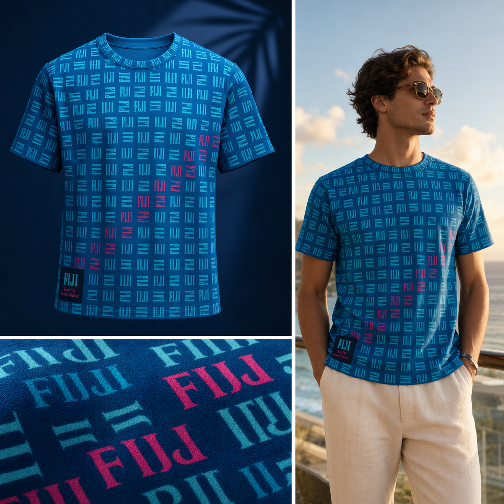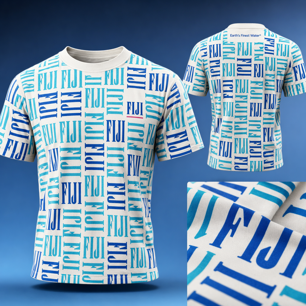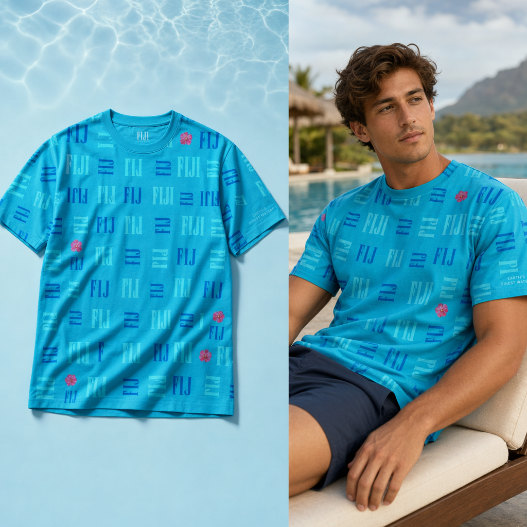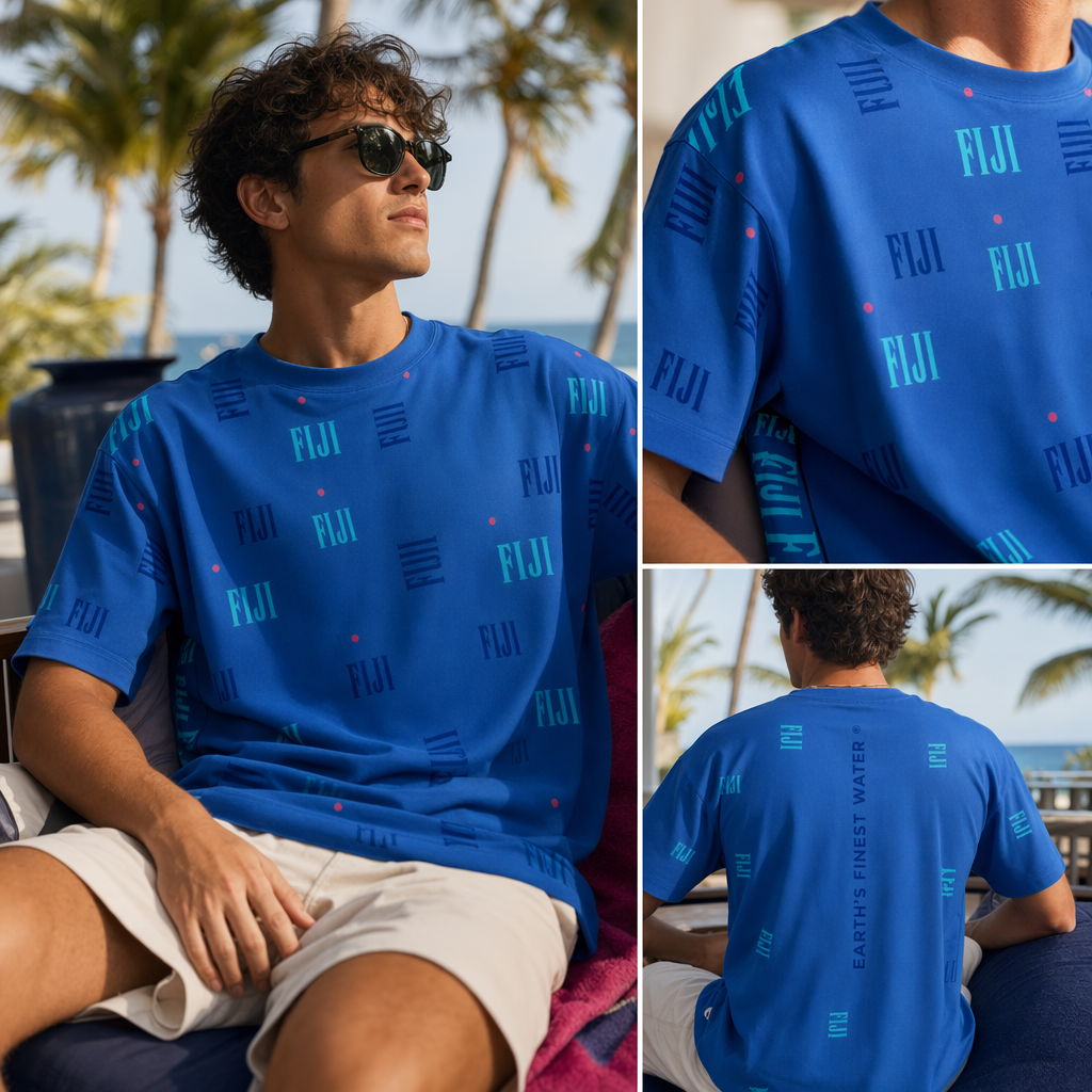 Photorealistic e-commerce mockup of a unisex FIJI Water “Rotated Wordmark Repeat Tee”. Midweight premium cotton t-shirt with a relaxed, slightly boxy fit, shown front-on on a ghost mannequin. Base color: clean hibiscus-tinged off‑white to keep focus on the print. All-over graphic built from the FIJI wordmark repeated in a tight grid, some instances rotated vertically, others horizontally, forming a subtle but bold pattern. Color palette strictly FIJI: alternating FIJI primary blue (#003DA5) and bright light cyan (#00C1D5) for each wordmark. Every wordmark remains crisp and legible, no distressing. On the left chest, one small standard FIJI logo sits upright in primary blue with a tiny magenta accent line beneath it to introduce the brand’s signature magenta without overwhelming the grid. Back of the tee (shown in secondary angled shot) features the campaign line “Earth’s Finest Water®” centered near the collar in small, refined sans serif in primary blue. Fabric surface is smooth with a soft matte finish, slight natural wrinkling around sleeves and hem. Lighting: soft studio lighting with cool daylight tone, slight gradient navy-to-light-blue background that hints at an oceanic feel without showing literal water. Camera framing tight on torso and shoulders, secondary close-up crop highlighting the rotated wordmark grid and ink texture. Overall vibe: laid-back, fashion-forward, affordable luxury street tee with a calm, relaxed mood.