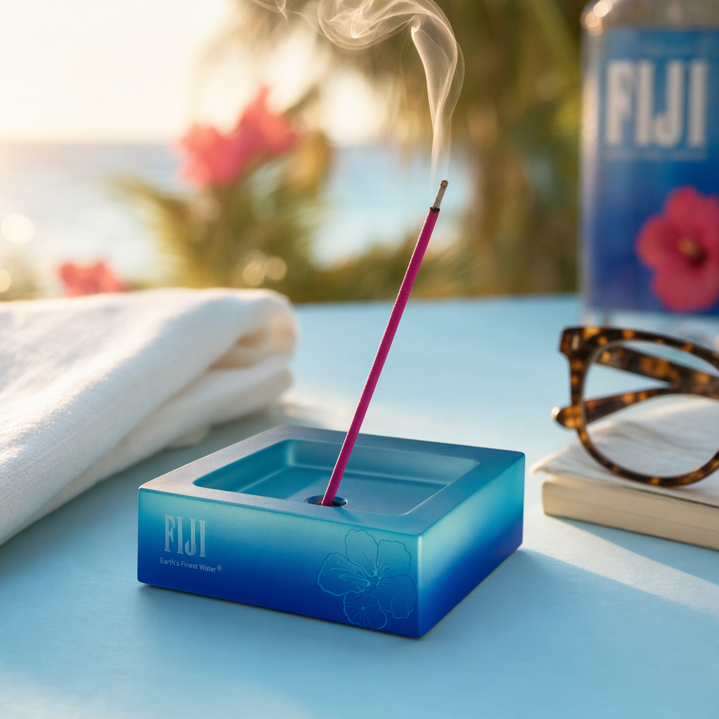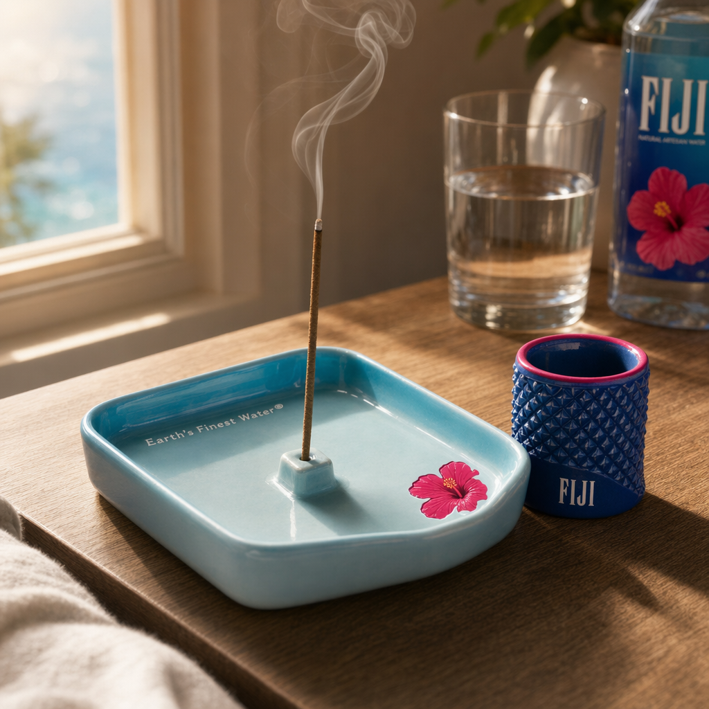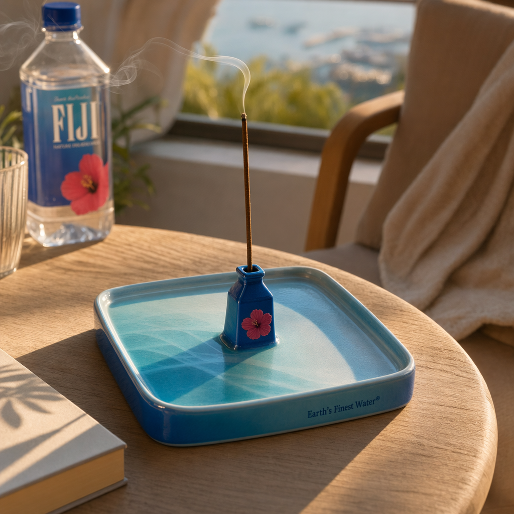 Photorealistic mockup of a FIJI Water “Finest Ritual” ceramic incense holder for everyday wind-down moments. The object is a low, square ceramic tray with softly rounded edges, its footprint echoing the iconic square FIJI bottle. Centered is a small, integrated cone incense stand shaped like a tiny FIJI bottle silhouette, glazed in glossy FIJI primary blue (#003DA5) with a delicate magenta (#E10098) hibiscus stamped on one side. The tray surface has a smooth satin glaze in a calm gradient from light aqua (#00C1D5) at one corner to ice blue (#BBDDE6) at the opposite, with a subtle, almost ghosted wave pattern that suggests island water without being literal. Along one edge, in tiny, debossed and color-filled navy (#041C2C) type, it reads: “Earth’s Finest Water®” – minimal and premium. A thin ridge around the tray catches ash, showing this is functional, not just decorative. The scene is shot on a warm, light wood side table at golden hour, with a stick of incense gently smoking from the blue bottle-shaped holder. In the softly blurred background, a FIJI bottle and a linen-covered lounge chair hint at a relaxed apartment or hotel balcony setting. Lighting is warm and directional from the side, with soft shadows and a relaxed, escapist mood. Camera angle is a slightly high 3/4 view that clearly shows the square form, bottle-shaped holder, and the brand colors and details.