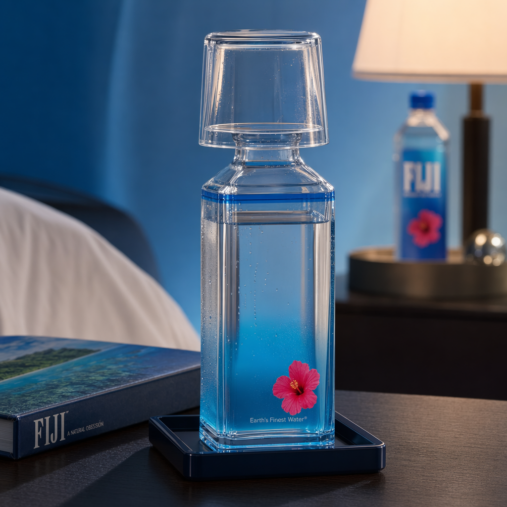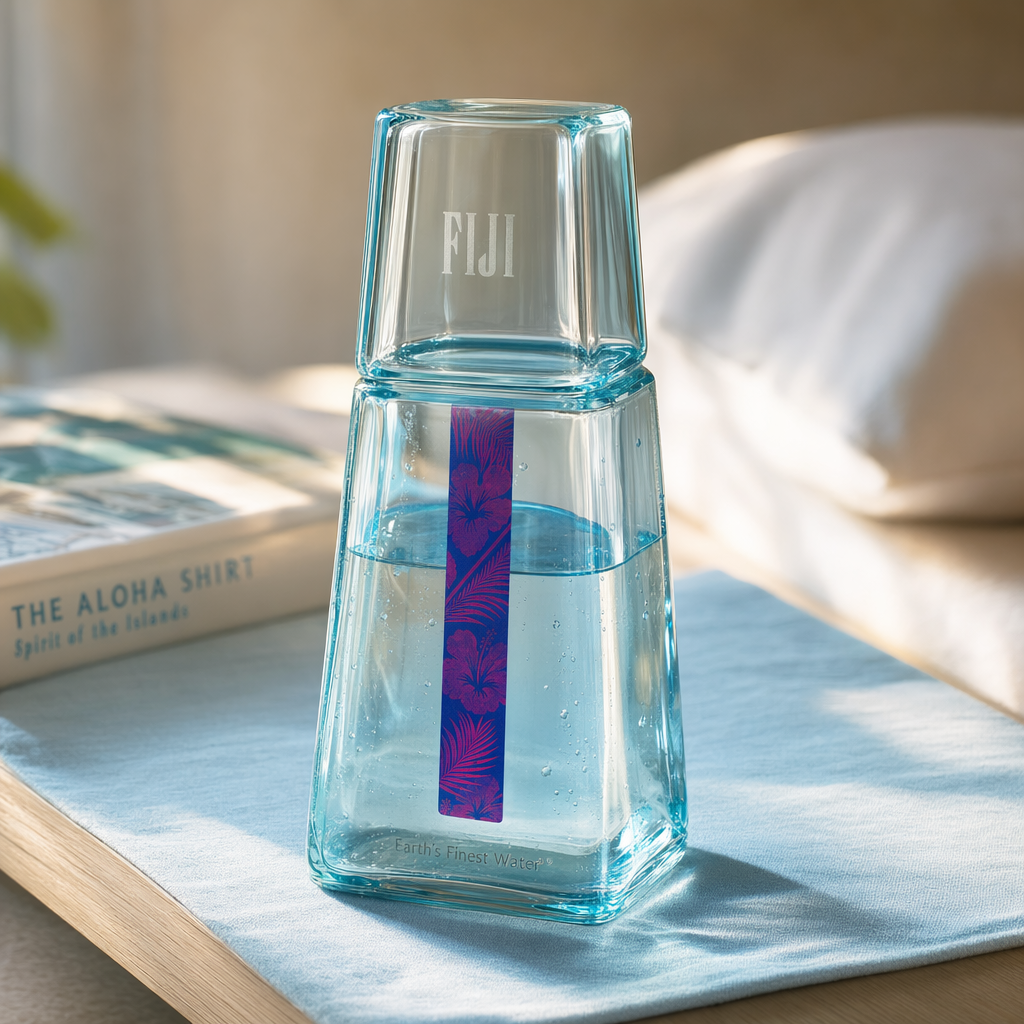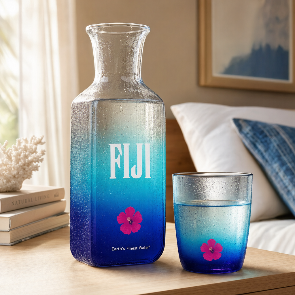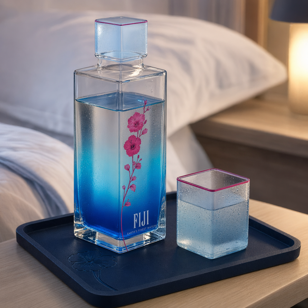 Photorealistic render of a FIJI Water “finest moments” bedside carafe set, designed as an affordable nightly ritual object. The set includes a small, square-based glass carafe and an inverted tumbler that nests on top as a lid. The silhouette of both pieces subtly echoes the iconic FIJI bottle: square footprint with elegantly chamfered corners and a gentle vertical taper. The glass is thick, ultra-clear, with a slight cool tint that shifts from soft FIJI light blue (#BBDDE6) at the base to a barely-there bright light blue (#00C1D5) near the top, like water catching tropical light. On one face of the carafe, there is a minimalist vertical FIJI blue (#003DA5) stripe with a micro-printed pattern of abstract hibiscus petals and palm fronds in a very soft magenta (#E10098), creating a sophisticated blue + magenta pattern that only reveals itself when light passes through. Near the base, discreet engraved text reads “Earth’s Finest Water®” in small, frosted lettering. The tumbler has a micro-sandblasted FIJI logo on one side that appears only when it catches the light. Surface finish: perfectly smooth, weighty glass, with tiny water droplets on the outside of the carafe suggesting chilled water. Lighting: warm morning or golden-hour bedroom light, soft and directional from the left, creating gentle caustics and reflections through the water and colored glass. Background: a light blue (#BBDDE6) linen bedside table runner on a pale wood nightstand, with blurred hints of a paperback book and a soft white pillow in the far background, all out of focus to keep attention on the carafe set and convey relaxation and escape. Camera: medium close-up at eye level to the tabletop, shallow depth of field, showing the full carafe and glass with slight angle to emphasize the square form and thickness of the glass, capturing a calm, intimate, emotionally rich nightly ritual.