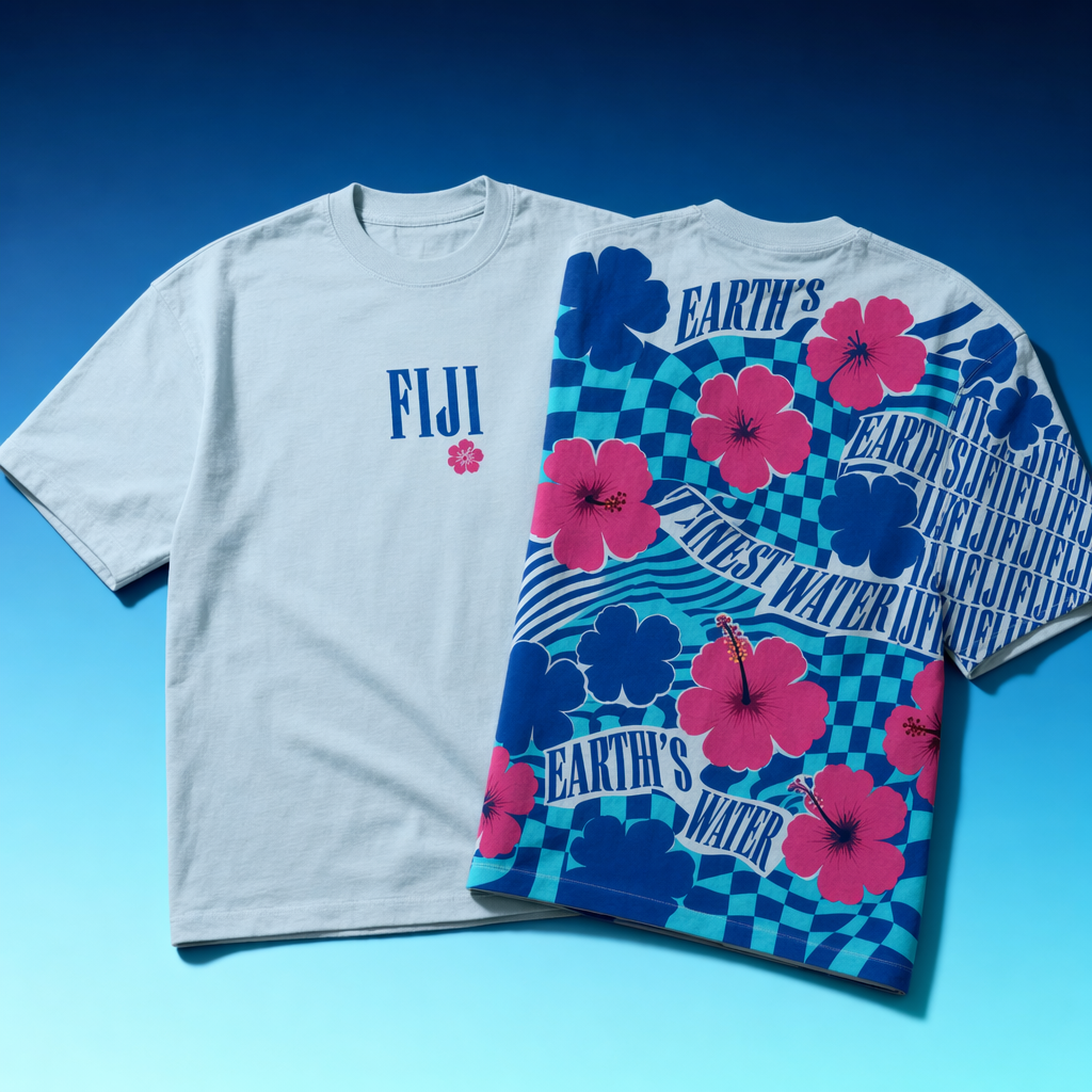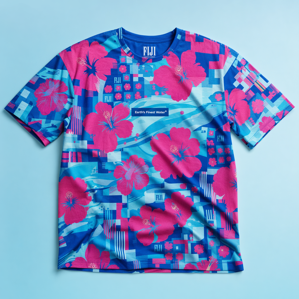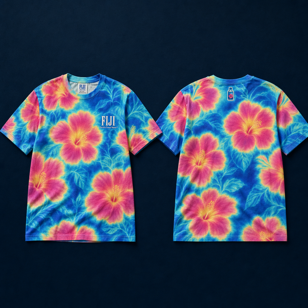 Photorealistic front-and-back flat lay of a unisex premium FIJI Water graphic T-shirt called “Hibiscus Heat Map Tee,” made from soft midweight cotton with a slightly relaxed, fashion-forward fit. The tee uses an all-over hibiscus floral pattern rendered like a tropical thermal camera visualization: overlapping hibiscus blooms and leaves drift across the shirt in smooth, heat-map style gradients of magenta hibiscus pink, bright yellow, cyan, and deep cobalt, with FIJI’s signature blue (#003DA5) and bright light blue (#00C1D5) subtly integrated into the gradient transitions. Warmer “hot zones” glow in magenta and yellow around the flower centers, fading to cyan and cobalt at the edges, creating a fluid, almost infrared topographic feel. The base of the fabric is a soft ice-blue tone (#BBDDE6) so the colors pop without feeling neon or harsh. On the left chest, a small, clean FIJI logotype in white with subtle blue outline sits above the campaign line “Earth’s Finest Water®” in tiny, refined type, staying secondary to the pattern. The back neck has a tiny square FIJI bottle icon in FIJI blue and magenta as a quiet brand signature. Printing technique is high-end sublimation or discharge print to keep colors saturated but the hand-feel soft and matte, with no plastic shine. Set the tee on a simple, slightly textured navy (#041C2C) background with soft, diffused studio lighting and a gentle top-down highlight, capturing realistic fabric folds, stitching, and neck tag details. Camera is overhead, straight-on, medium framing showing the entire tee, with a slight vignette that keeps focus on the electric tropical heat-map pattern and the blue + magenta pairing.