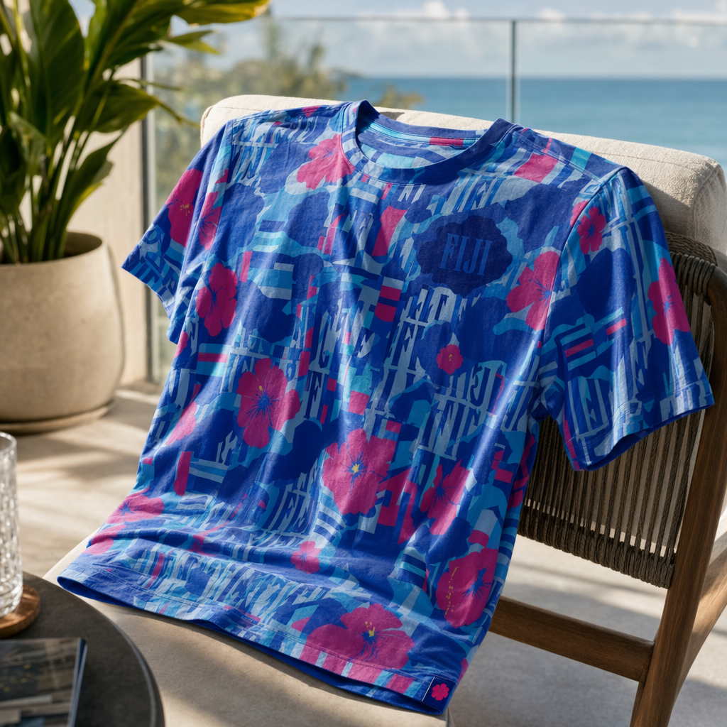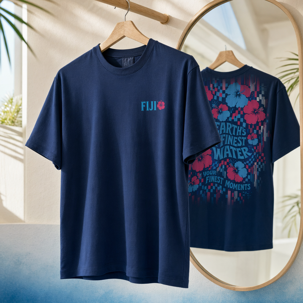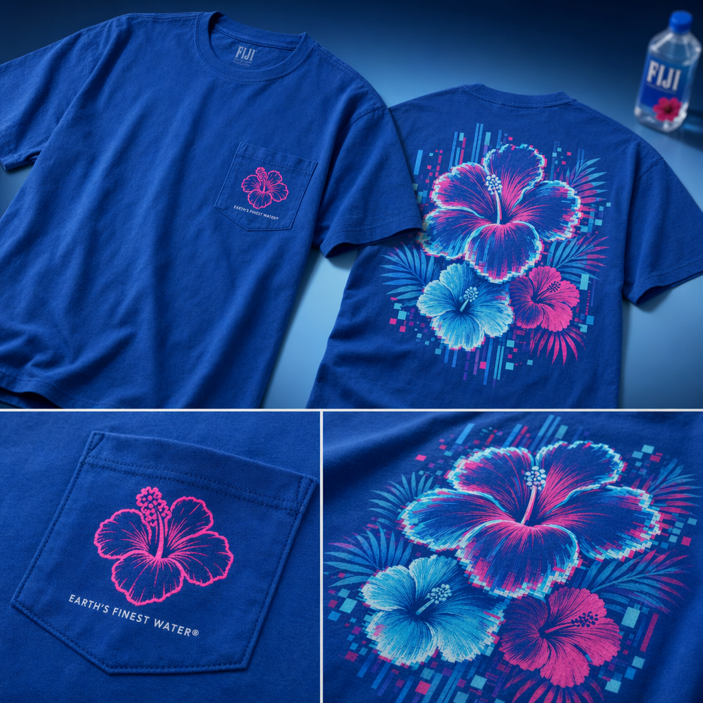 Photorealistic studio render of a unisex FIJI Water “Neon Hibiscus Pocket Tee,” laid flat on a seamless backdrop. T-shirt: relaxed, slightly boxy mid-weight cotton, ultra-soft, in a rich FIJI electric cobalt blue (hex #003DA5–#005EB8 range) with a subtle garment-washed finish for a lived-in, premium feel. Front design: a clean left chest pocket with a small, crisp hot magenta hibiscus icon (hex #E10098), minimalist linework with a slight neon glow edge, and a tiny ‘Earth’s Finest Water®’ tagline in micro white type tucked beneath the flower. Back design: large oversized “glitch floral” graphic filling the upper back, composed of layered hibiscus blooms and palm fronds in electric blue, cyan (#00C1D5), light ice blue (#BBDDE6) and hibiscus magenta, slightly offset to create a digital RGB shift/glitch effect. Incorporate subtle square motifs and vertical bars referencing the FIJI bottle shape and label grid, integrated into the floral pattern, not as obvious logos. Color palette must hero FIJI blue + magenta, with accents of light blue and cyan. No big front logo lockups, the vibe is fashion-forward street boutique, not promotional merch. Lighting: soft directional studio lighting from top-left, with gentle shadows to reveal fabric texture and pocket depth, slight specular highlight on the ink to show high-quality screen print. Background: smooth navy (#041C2C) to light blue gradient echoing FIJI’s bottle gradient; a single FIJI bottle slightly blurred in the far background for context, but the tee remains the clear hero. Camera: overhead flat-lay, slightly off-center composition with a detail close-up inset of the pocket and the back print glitch edges to emphasize print quality and color vibrancy.