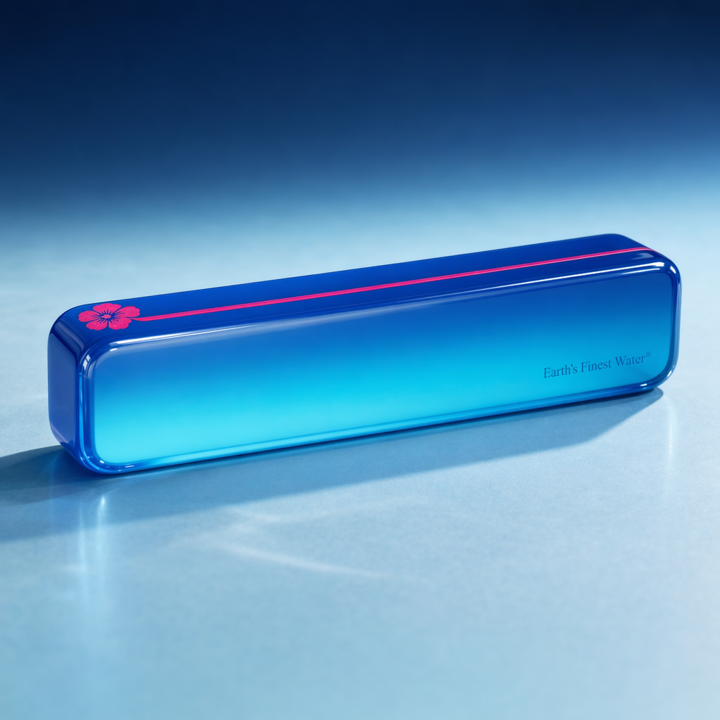 Photorealistic product shot of a FIJI Water inspired sculptural object shaped like a minimal, glossy blue em dash “—” character, designed as a desk totem that represents a pause in the day. The object is a solid, smooth bar with softened edges, finished in a rich FIJI primary blue (#003DA5) with a subtle vertical bottle-like gradient into bright light blue (#00C1D5) along the front face. A thin inlaid magenta (#E10098) hibiscus line runs along the top edge as a delicate accent, with the small line of text “Earth’s Finest Water®” debossed in micro type at one end, tone-on-tone in slightly darker blue, premium and understated. Material is high-gloss lacquered resin with a hint of translucency at the edges, catching light like water. The object rests on a pale ice-blue (#BBDDE6) matte surface with a soft-focus navy (#041C2C) to light blue gradient background, evoking a calm horizon. Bright but diffused daylight from the upper left creates gentle reflections and subtle caustic-like highlights, suggesting liquidity without literal water splashes. Camera is a clean studio-style 3/4 angle, slightly above eye level, medium close-up, with shallow depth of field to keep background soft. The overall mood is relaxed, modern, fashion-forward desk luxury: an affordable, personal ritual object that signals “take a breath” rather than ostentatious status, iconic and unmistakably FIJI through blue + magenta, minimal logo use, and elevated finish.