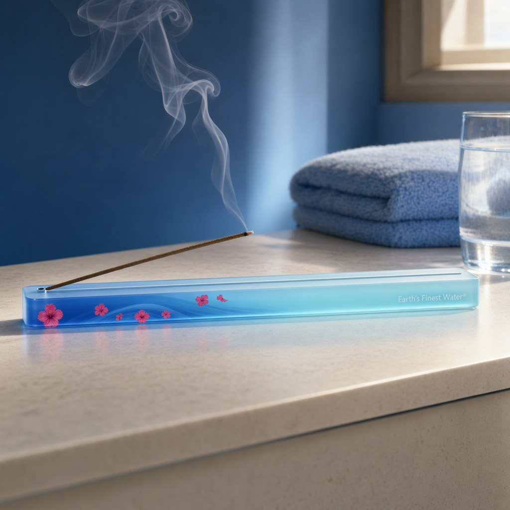 Ultra-realistic render of a FIJI Water ‘finest moments’ incense holder bar shaped like a long, low dash “—”, positioned as a daily wind-down ritual object. The form is a slim rectangular bar with softly rounded corners and a shallow linear groove along the top to cradle a single incense stick; one end has a tiny drilled hole for vertical placement. The base material is satin-finished frosted acrylic in light FIJI blue (#BBDDE6) with a subtle inner glow, suggesting cool spring water. Along one long side, a gradient wave pattern flows from deep FIJI blue (#003DA5) to bright turquoise (#00C1D5), with small, scattered magenta (#E10098) hibiscus petals printed in a soft, almost airbrushed style. On the opposite side, discreet small-type text reads “Earth’s Finest Water®” in white, aligned to the right for a fashion-accessory feel. Background is a serene bathroom or bedroom vignette: a smooth off-white stone counter, a softly blurred hint of a folded cornflower-blue towel and a glass of water in the distance, all in cool tones. Lighting is warm-diffused late-afternoon window light from the right, creating gentle shadows and subtle reflections on the acrylic. A light wisp of incense smoke curls upward, captured sharply against a navy-to-light-blue gradient wall, reinforcing relaxation and escape. Camera is a lifestyle close-up, slightly low angle, focusing on the bar with shallow depth of field, making it feel like a personal, everyday luxury ritual, effortlessly cool and clearly ownable to FIJI via color, hibiscus detail, and the calm, spa-like mood.