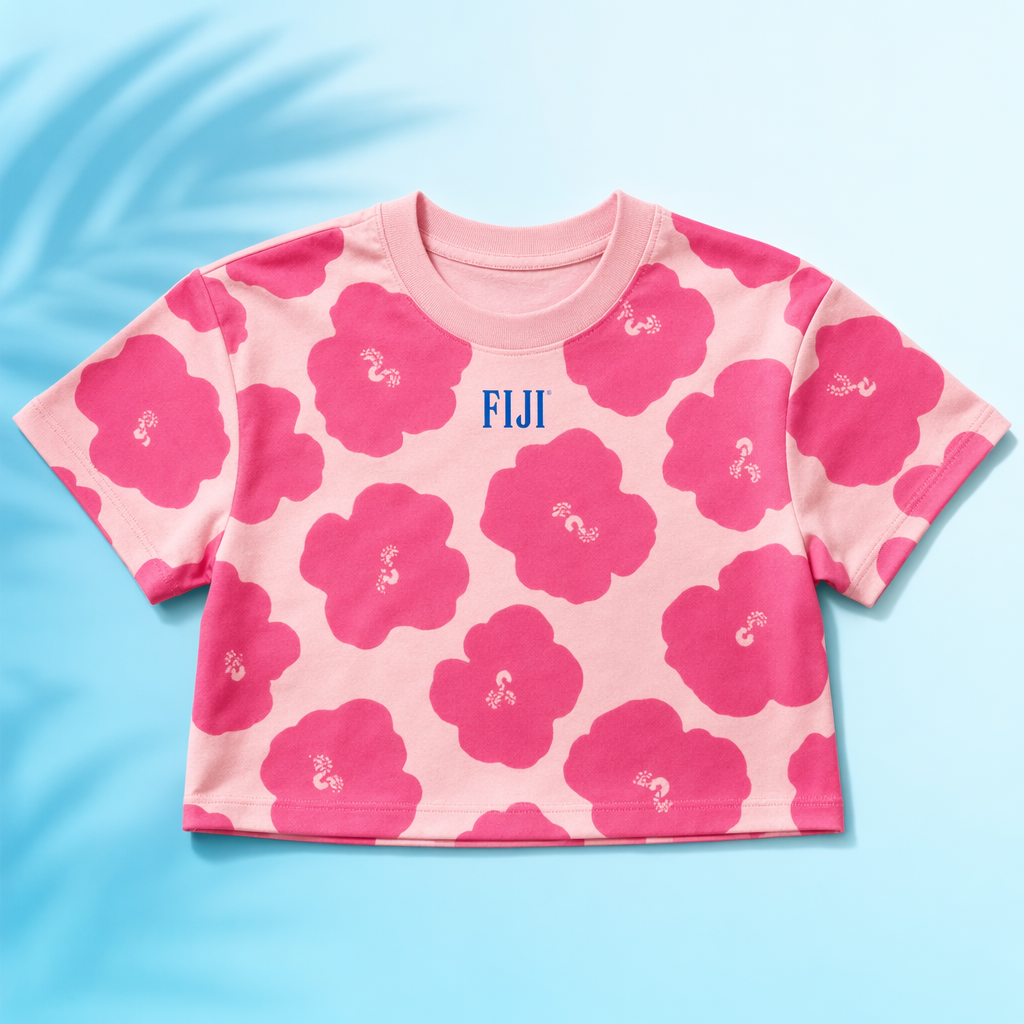 input: 6. Pink Bloom Baby Tee — Cropped baby tee with hot pink hibiscus blobs on a soft pink base, small FIJI logo at center chest.