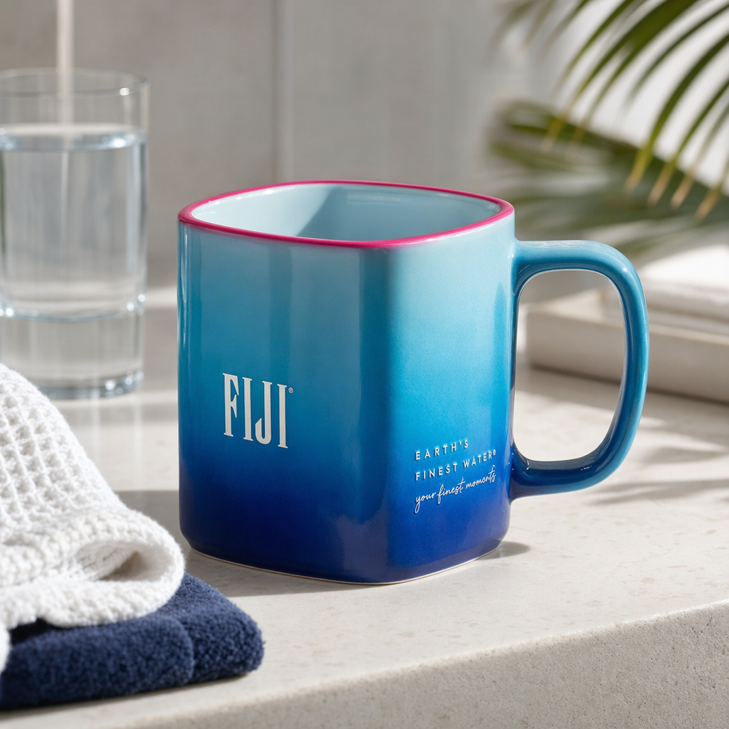 Photorealistic studio shot of a FIJI Water inspired ceramic ritual mug, designed as “liquid luxury for your everyday pause.” The mug form is slightly squared in cross-section, subtly echoing the FIJI bottle silhouette, with softly rounded corners and a comfortable, thick handle. Exterior: high-gloss gradient glaze that moves from deep FIJI primary blue (#003DA5) at the base into bright light blue (#00C1D5), then kissed with a thin rim of hibiscus magenta (#E10098) at the lip. On one side, a small, tasteful FIJI wordmark in white; on the opposite side, debossed and glaze-filled text in tiny caps reading: “EARTH’S FINEST WATER®” and, beneath it, “your finest moments” in a clean, modern script. Inside of the mug is a smooth light ice blue (#BBDDE6) that feels cooling and spa-like when you look in. The base has a subtle etched hibiscus icon and a square “island tile” motif, tone-on-tone in blue, hinting at FIJI’s island origin without feeling like a souvenir. Surface finish is premium, weighty ceramic with a faint reflection of light, no visible defects. The setting is a minimalist bathroom or kitchen counter ritual scene: pale stone countertop with a soft stack of white and navy towels, a small clear glass of water, and a blurred hint of palm leaves in the background suggesting an escape to Fiji. Color palette anchored in FIJI blues and magenta accents; no other bright competing colors. Lighting is soft morning natural light from the side, casting gentle shadows and subtle highlights in the glaze, conveying calm, relaxation, and wellness. Camera is a tight three-quarter product shot, slightly above eye level, with shallow depth of field so the mug is crisp and the background is creamy and out of focus. Overall mood: laid-back, cool, affordable luxury, an everyday coffee or tea ritual that could only feel this way with FIJI.