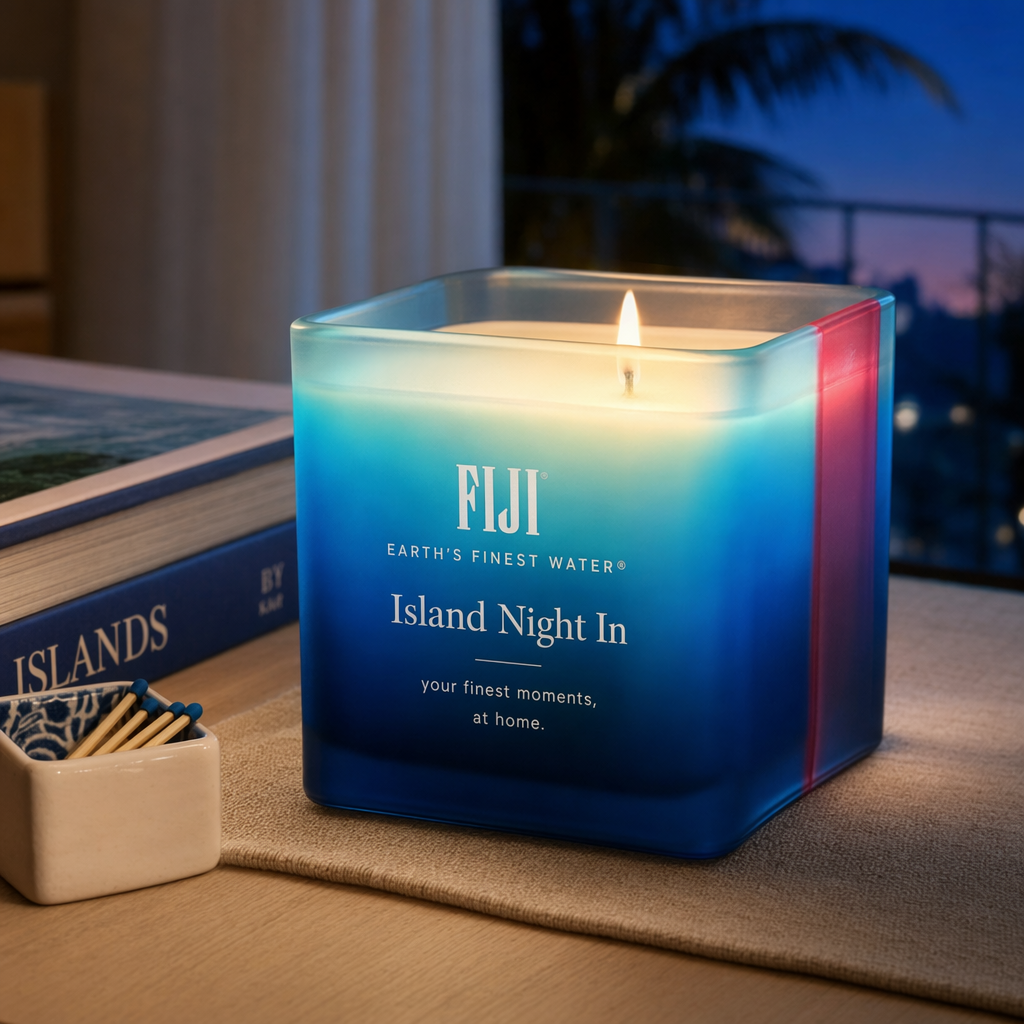 Photorealistic lifestyle render of a FIJI Water “square island” scented candle, created as a personal unwind ritual for evenings. The candle vessel is a thick, frosted glass in a perfectly square footprint, clearly inspired by the iconic FIJI bottle shape, with softly chamfered edges and a heavy, premium base. The glass color is a vertical gradient: deep FIJI navy (#041C2C) at the bottom transitioning through FIJI primary blue (#003DA5) into bright lagoon blue (#00C1D5) near the top. Around one edge, a slim wrap of translucent hibiscus magenta glass creates a playful signature band when lit. Centered on one side in crisp white type: “EARTH’S FINEST WATER®” with a small FIJI logo above and a scent name below, e.g., “Island Night In,” plus tiny copy: “your finest moments, at home.” The wax is an off-white, with a single clean cotton wick. When burning, the flame softly illuminates the gradient and magenta band so the blues glow like underwater light. Surface finish of the glass is satin-frosted, catching highlights without strong reflections. The candle rests on a sand-colored linen runner beside a square ceramic match holder and a neatly stacked book with a blue spine, all on a light wood table by a window. Background shows an out-of-focus hint of a balcony, a palm frond, and twilight sky in navy blue, evoking relaxation and escape without being a party scene. Lighting comes from warm candlelight plus faint cool blue evening light from the side, creating a cozy but elevated mood. Camera is a close-up, slightly low angle at table height, focusing sharply on the candle vessel, with shallow depth of field and some bokeh in the distant background. The overall vibe: effortless, well-traveled, non-ostentatious affordable luxury, a nightly wind-down ritual that feels unmistakably FIJI through its square form, blue + magenta palette, and island escape atmosphere.