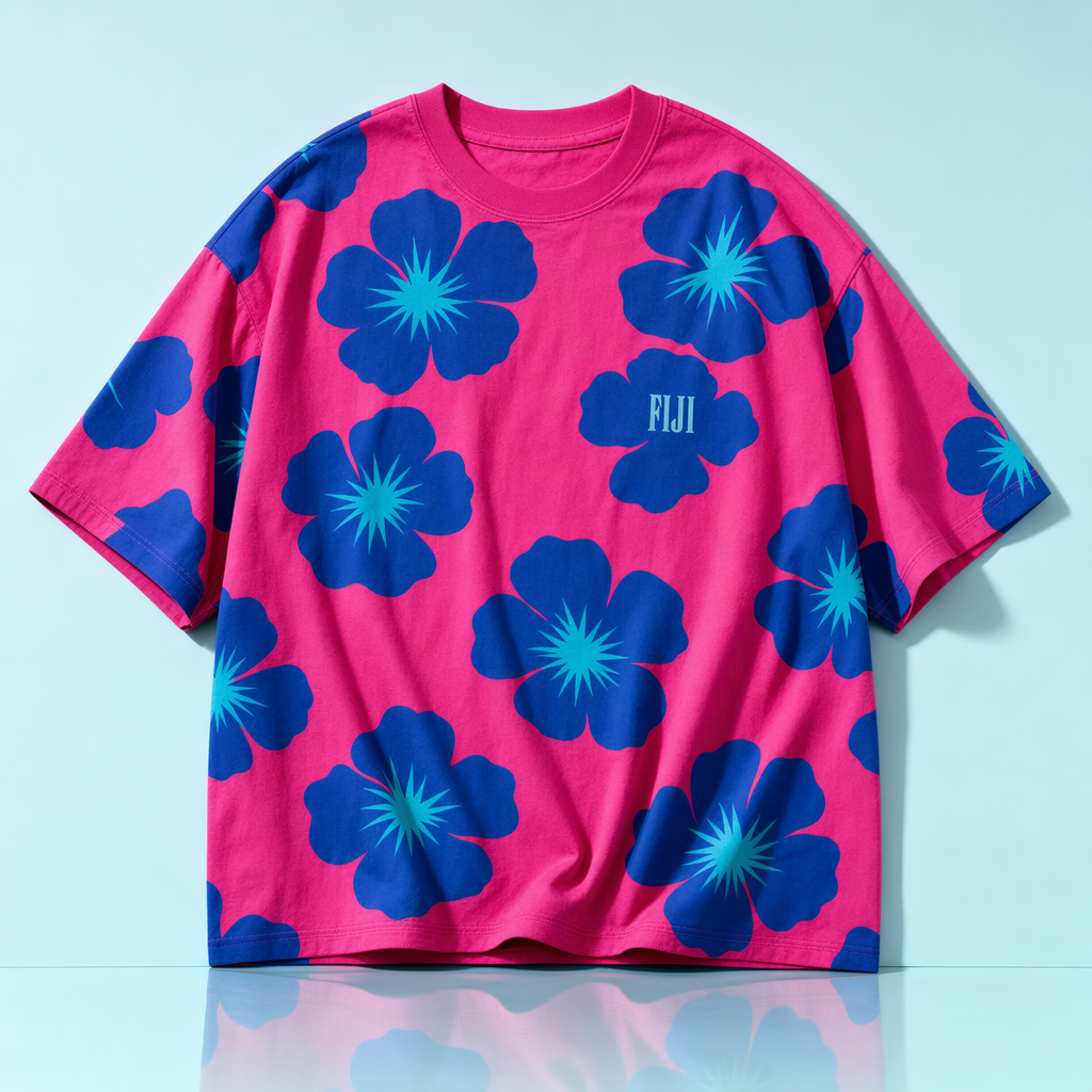 Photorealistic apparel flat-lay of an oversized unisex FIJI Water T-shirt, styled as an affordable-luxury fashion basic. The tee is premium midweight cotton with a soft, washed finish, slightly boxy and relaxed with dropped shoulders, thick ribbed collar, and clean stitching. Base color of the shirt is a rich hot pink / magenta (PMS Rhodamine, #E10098), smooth and even, no visible heathering. Covering the entire body and sleeves are oversized, loosely spaced hibiscus flowers rendered in deep cobalt / primary FIJI blue (PMS 293, #003DA5) with bright cyan centers (PMS 3115 C, #00C1D5). The hibiscus silhouettes feel graphic and modern, not tropical cliché: crisp edges, some flowers cropped off at seams, some rotated for a playful scattered pattern. On the upper left chest, subtly integrated into one of the blue petals, is a small tone-on-tone FIJI wordmark in light blue (#BBDDE6), almost hidden, emphasizing confidence and restraint. Lighting is soft studio daylight, slightly directional from top left, creating gentle fabric folds and natural shadows that highlight the drape and thickness of the tee. Background is a clean, ice-blue (#BBDDE6) seamless paper with a faint gradient to white, evoking water and sky. Camera is top-down, product perfectly centered, sleeves slightly angled out to show the oversized cut. Add a faint reflection under the tee to nod to liquid luxury. No human model, no clutter, just a refined, iconic hero shot that feels relaxed, playful, and premium.