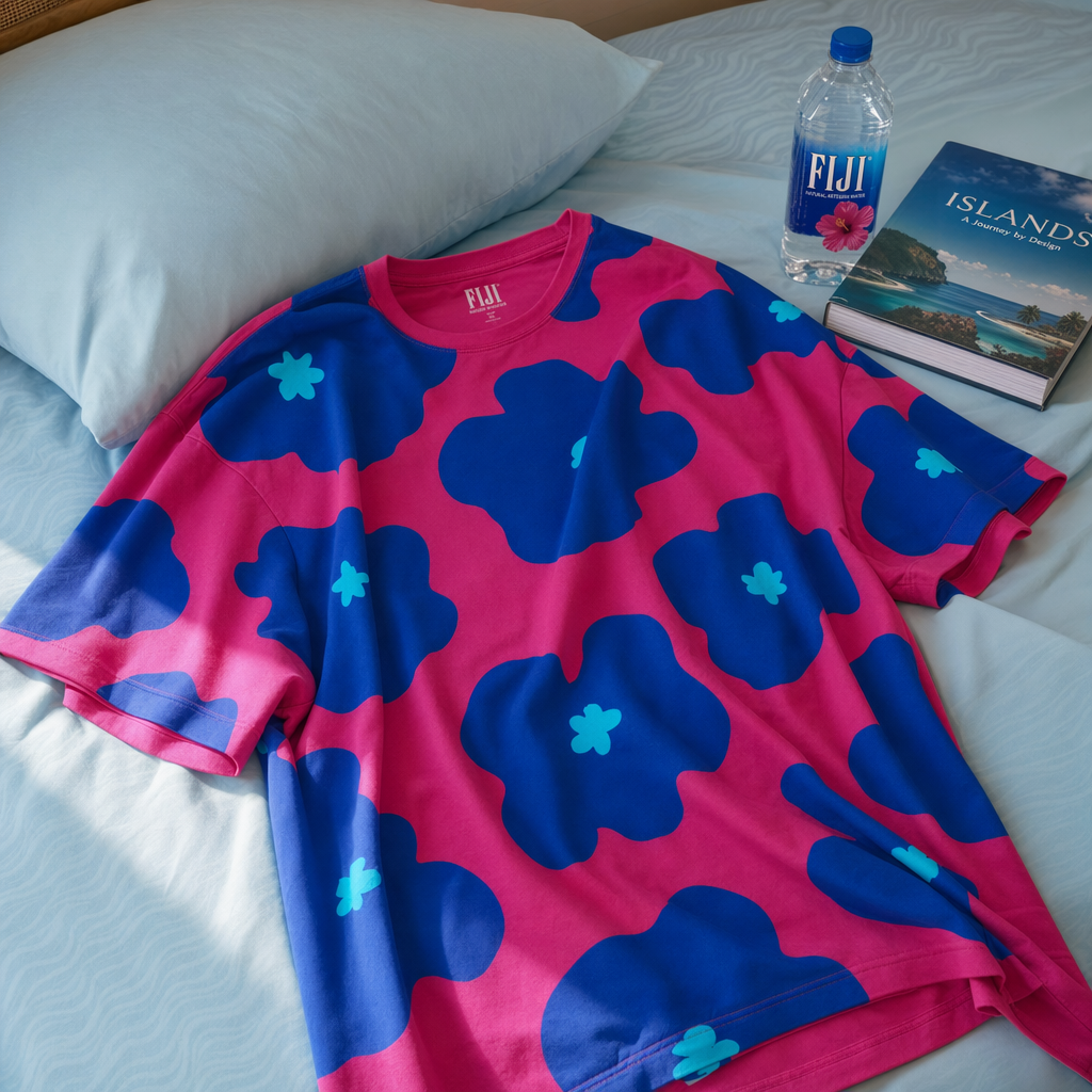 Photorealistic lifestyle shot of an oversized FIJI Water "Blue Hibiscus" tee styled on a soft bed scene to emphasize relaxation and everyday ritual. The T-shirt is laid out casually on a neatly made bed, partially folded at the hem with one sleeve tucked under to show natural drape. Fabric is high-quality combed cotton jersey with a slightly silky, luxurious hand. The base color is vibrant hot pink / hibiscus magenta (PMS Rhodamine, #E10098). Across the entire shirt, including sleeves, are very large, bold hibiscus flowers in primary FIJI blue (PMS 293, #003DA5), spaced irregularly as an allover print; each flower center is a pop of bright cyan (PMS 3115 C, #00C1D5), creating the signature blue + magenta pairing. The pattern feels fashion-forward and confident, with some flowers partially cut off by seams to suggest a designer textile. A small "Earth’s Finest Water®" line in crisp white sits delicately just above the hem on the back neck or lower side seam, minimal and tasteful. Bed linens are light blue (#BBDDE6) with a subtle, almost imperceptible wave texture, and there’s a transparent FIJI bottle and a hardcover travel book near the pillow to hint at escape and wellness. Lighting is natural morning window light, soft and diffused, with gentle shadows and a warm, relaxed mood. Camera angle is 3/4 overhead, focused primarily on the chest area so the oversized hibiscus pattern reads clearly while still showing the roomy, laid-back fit of the tee.