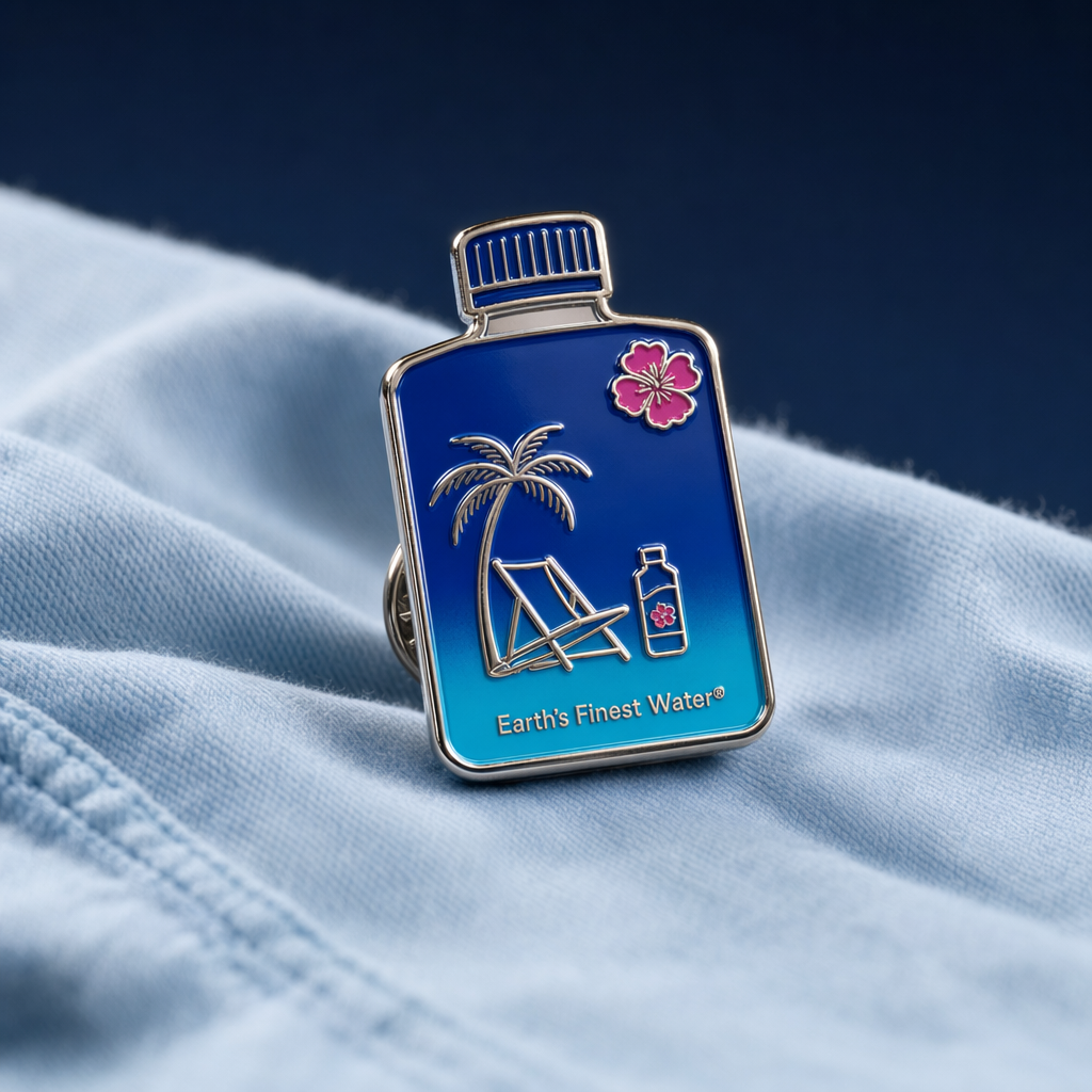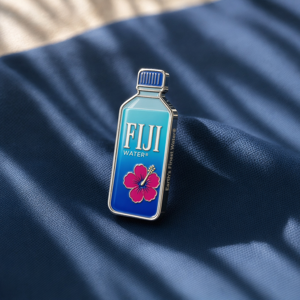 Photorealistic product shot of a FIJI Water-inspired enamel pin called the “Pause Button.” The pin is a small, square-cornered soft enamel pin in FIJI primary blue (#003DA5), shaped like a perfectly simplified FIJI bottle front panel. In the center, instead of a logo, there’s a minimal line-art illustration of a lounge chair under a palm tree next to a tiny square FIJI bottle, all in polished silver metal lines with a subtle magenta (#E10098) hibiscus flower accent. Under the illustration, in tiny but legible raised metal type, it reads: “Earth’s Finest Water®” in one line. Background metal is polished nickel, enamel colors are FIJI blue base with a faint gradient to bright light blue (#00C1D5) at the bottom, and a small magenta hibiscus icon in the corner to echo the bottle label. The pin is photographed on a soft, folded cotton shirt in light blue (#BBDDE6), with a shallow depth of field and natural soft daylight from the side, giving gentle reflections on the metal and enamel. The vibe is laid-back and aspirational but casual – it feels like an affordable little luxury you’d wear on a denim jacket or beach tote. Clean navy (#041C2C) gradient backdrop beyond the shirt, no clutter, camera is a tight 3/4 macro angle highlighting the glossy enamel, pin clasp subtly visible.