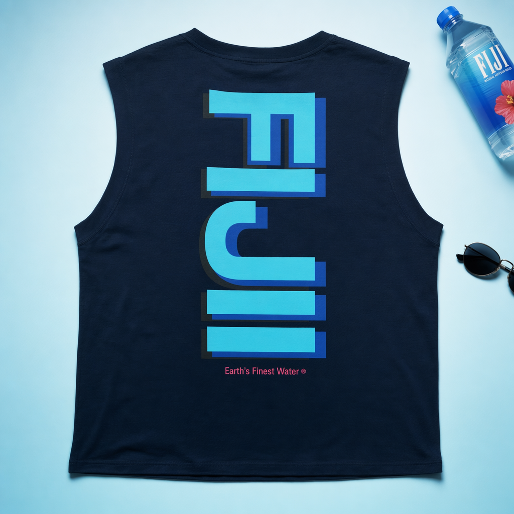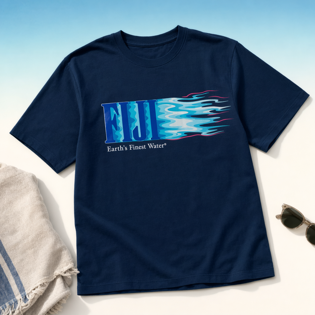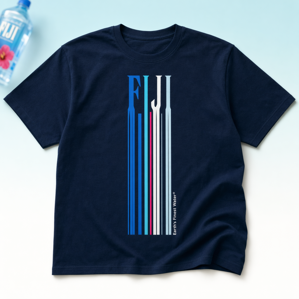 Photorealistic flat-lay of a premium unisex FIJI Water graphic t-shirt called “Surf Glitch Logo Tee,” laid neatly on a clean surface. The tee is made from midweight combed cotton with a soft, slightly sueded finish, relaxed fit, no visible wrinkles, minimal side seams. Base color: deep navy (PMS 296 / #041C2C). Center chest graphic: the classic FIJI wordmark in primary FIJI blue (PMS 293 / #003DA5), perfectly crisp. A digital “surf glitch” treatment pulls the logo horizontally to the right as if dragged by a wave: multiple echo layers in bright light cyan (PMS 3115 / #00C1D5) and lighter ice blue (PMS 7457 / #BBDDE6) trail behind the main wordmark, forming a wavy, pixel-shifted ribbon. Thin magenta (PMS Rhodamine / #E10098) accent lines subtly trace the outermost glitch wave, adding FIJI’s signature blue + magenta pairing without overwhelming the design. The glitch shapes are smooth and liquid rather than harsh pixels, evoking ocean swells and relaxed island escape, not techy distortion. Under the logo, in small, refined lettering, appears the campaign line “Earth’s Finest Water®” in white, perfectly centered. Printing method is high-quality screen print with slight gloss on the logo to catch light, sitting on a matte cotton surface. Background: softly lit gradient from light blue (PMS 7457) at the top to white at the bottom, evoking sky meeting water. Soft natural studio lighting with gentle shadows, top-front directional, no harsh reflections. Camera angle: overhead, slightly offset to show shoulder and hem, with a pair of simple, tasteful lifestyle props at the edges (a folded light linen beach towel and a pair of minimalist sunglasses) softly out of focus to suggest everyday coastal relaxation without stealing focus from the tee. Emphasize clean, elevated, non-streetwear, aspirational but accessible vibe.