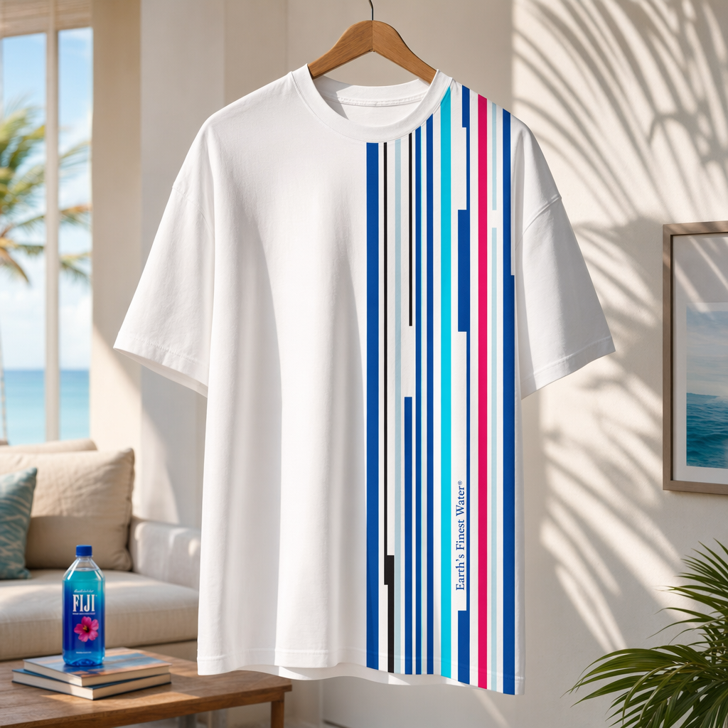 Photorealistic lifestyle mockup of a FIJI Water “Barcode Tee” hanging on a simple wooden hanger in a bright, relaxed room, suggesting an everyday vacation wardrobe. The t-shirt is premium, slightly oversized, with a crisp but soft drape and subtle drop shoulder, made from high-quality cotton jersey. Base color: clean white to let the barcode graphic pop. Running vertically off-center on the front, from just below the collar down toward the hem, is a tall stripe block made from FIJI letters stretched and distorted into long, barcode-like columns. Colors alternate in a rhythm of FIJI primary blue (#003DA5), bright cyan (#00C1D5), light blue (#BBDDE6), and black, with a single bold hibiscus magenta (#E10098) column acting as a playful “scan line.” Overlaid delicately across one section of the stripes in small, tonal navy type is the line “Earth’s Finest Water®” rotated 90 degrees, as if it’s printed like product information on a barcode label. The graphic feels like a fashion print first, brand second—abstract, cool, and wearable. Background: softly blurred interior with hints of a sunlit window and a palm frond shadow cast on the wall, nodding to FIJI’s island origin and relaxation territory. Color palette of the environment leans into pale blues (#BBDDE6), warm neutrals, and subtle reflections of FIJI blue, keeping focus on the shirt. Lighting is natural late-afternoon sunlight, warm and directional, creating gentle highlights on the fabric and soft shadows on the wall. Camera is framed at a three-quarter angle, mid-shot, focusing on the upper two-thirds of the shirt so the barcode graphic is clearly legible while still communicating a laid-back, aspirational closet moment.