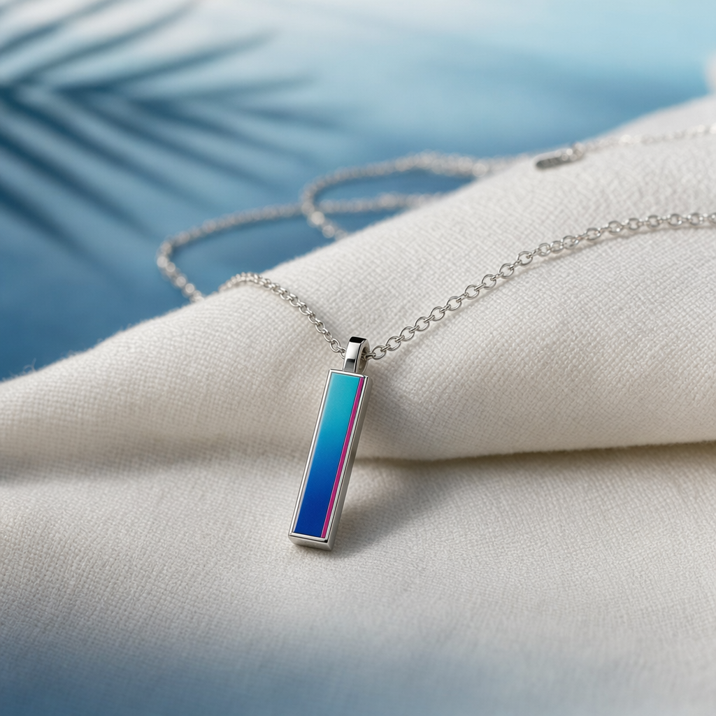 Photorealistic studio shot of a FIJI Water-inspired minimalist pendant necklace designed as an affordable daily luxury ritual piece. The pendant is a tiny, sleek, rectangular bar subtly echoing the iconic FIJI bottle’s square silhouette, crafted from polished stainless steel with a soft brushed finish on the larger surfaces and mirror polish on the edges. One face of the bar features a vertical gradient enamel in FIJI blues (#003DA5 at the base blending into #00C1D5), with a slim magenta hibiscus-pink stripe (#E10098) running asymmetrically along one edge as the signature accent. The opposite face is clean, with a micro-engraving reading “Earth’s Finest Water®” in a refined, discreet type, small enough to feel like a personal mantra rather than loud branding. The pendant hangs from a fine, high-quality, adjustable chain that feels effortless and wearable with beachwear or a casual blazer. Lighting is soft and diffused, like late-afternoon coastal light, creating gentle highlights on the metal and subtle reflections in the enamel. Background is a serene, defocused blend of ice-blue and light navy (#BBDDE6 and #041C2C) with soft bokeh and a hint of palm frond shadow to nod to escape and relaxation without becoming a busy lifestyle scene. Camera framing is close-up macro on the pendant lying casually on a folded, off-white linen surface, with the chain loosely curved, depth of field shallow so the pendant is in sharp focus while the linen texture and background blur out, conveying intimate, personal, everyday ritual luxury.