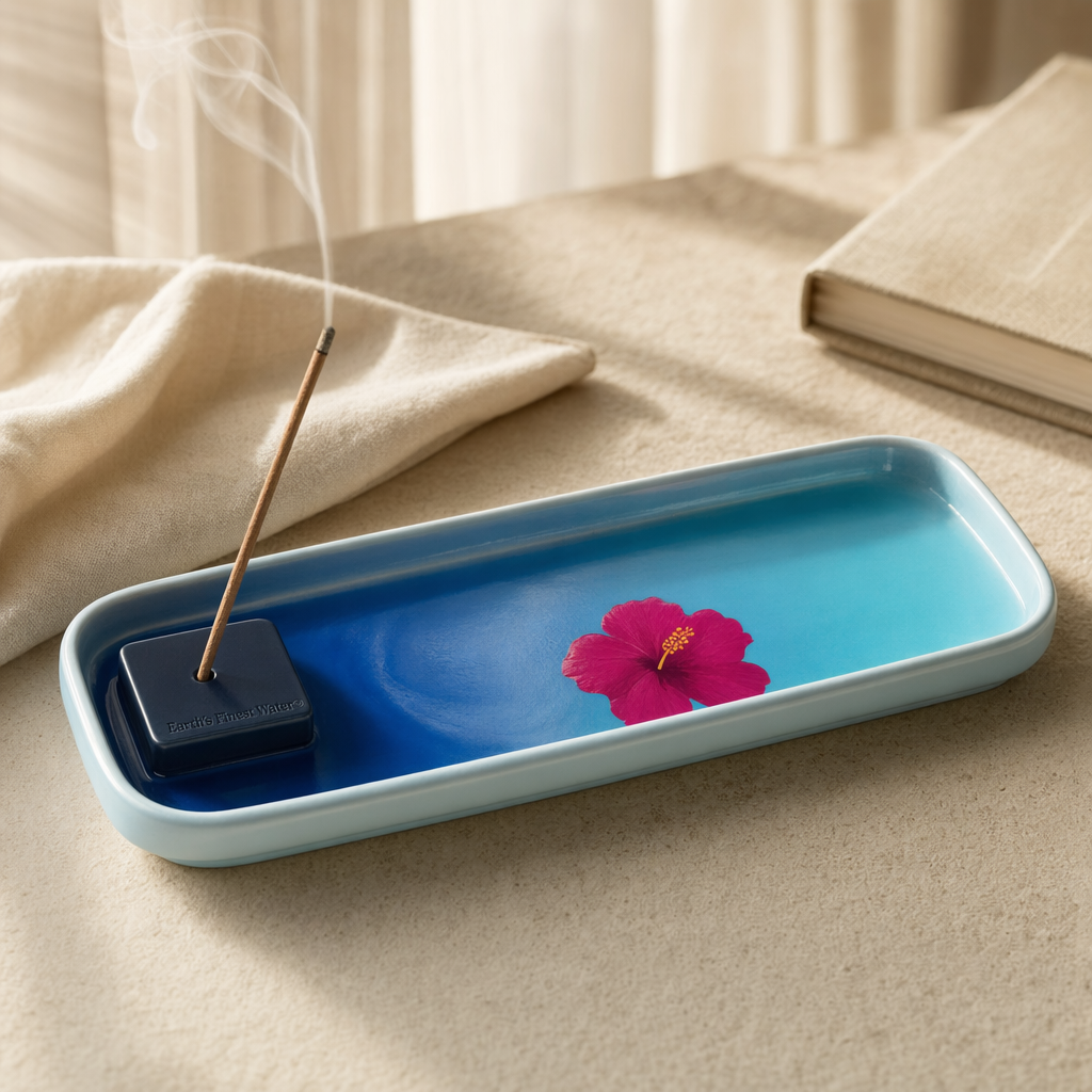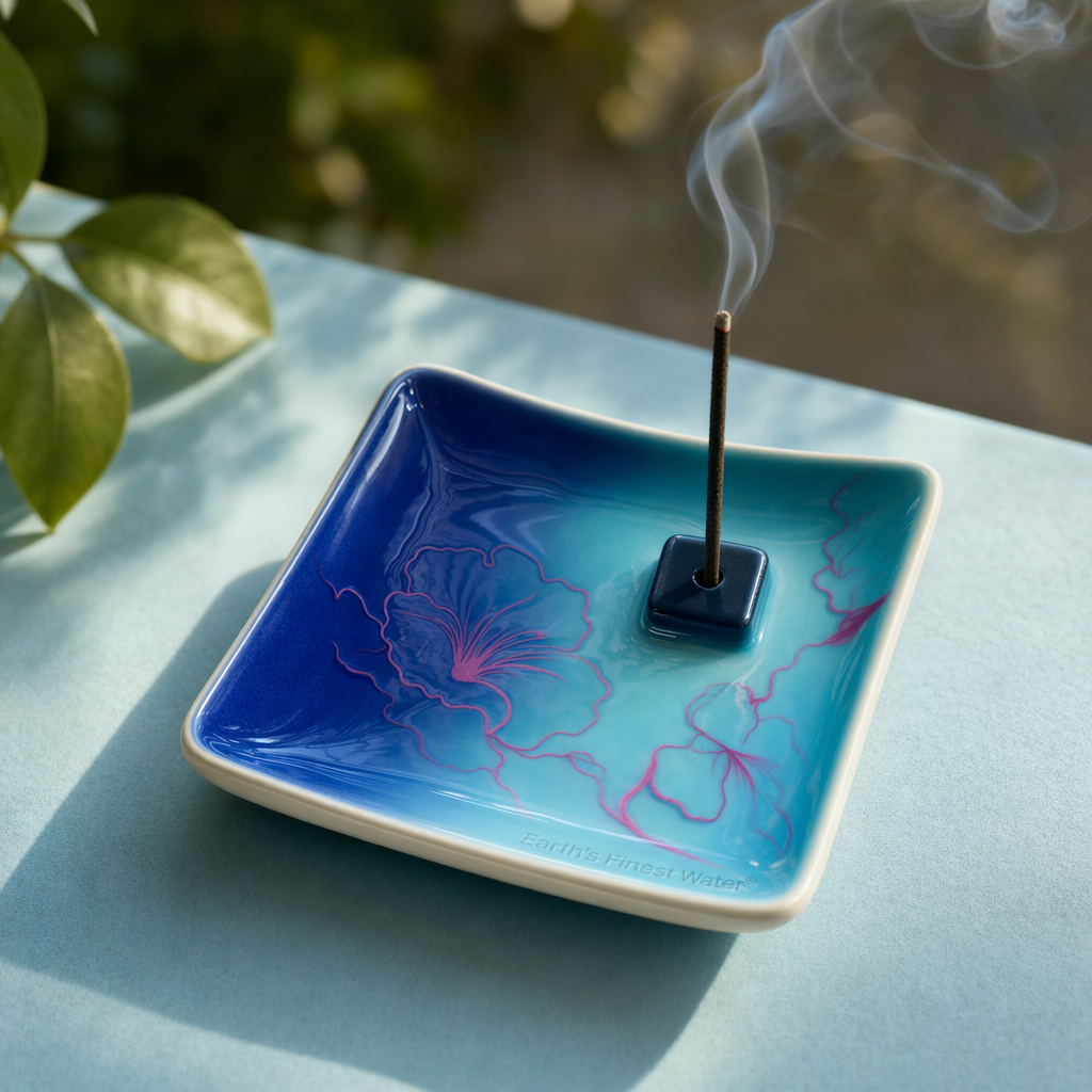 Photorealistic tabletop render of a FIJI Water inspired ceramic incense holder dish that turns a daily wind-down into a FIJI escape. The dish is a small, square, gently upturned tray referencing the iconic FIJI bottle silhouette from above, crafted in smooth matte porcelain. Interior surface features a luxurious but understated glossy glaze: a flowing water gradient from deep FIJI blue (#003DA5) at one corner, washing into bright light blue (#00C1D5) across the center, with thin, organic magenta (#E10098) hibiscus-petal lines drifting through the blue like petals on water. In one corner, a tiny raised square “island” in navy (#041C2C) holds a discreet hole for a single incense stick, keeping the form calm and minimal. The phrase “Earth’s Finest Water®” is embossed in very small, tone-on-tone lettering along one edge of the dish – visible on close inspection but not loud. Lighting is warm, late-afternoon natural light from a nearby window, soft shadows and subtle reflections in the glaze, evoking relaxation and inward ritual. Background: a simple, slightly textured light blue (#BBDDE6) surface, a hint of soft-focus greenery and bokeh in the far background, no clutter, no other objects with branding. Camera framing: slightly overhead 3/4 view capturing the square geometry and color gradient, with a lit incense stick producing a thin wisp of smoke curling upward, adding movement and serenity without obscuring the product. Overall mood: calm, elevated, everyday luxury at home, unmistakably FIJI through color, square form, and hibiscus cues.