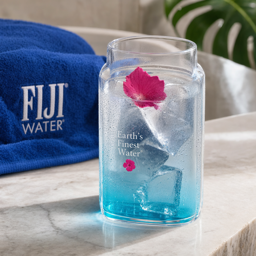 Photorealistic lifestyle shot of a FIJI Water-branded, double-wall insulated glass tumbler for at-home spa rituals. The tumbler has a sleek, cylindrical shape with a slightly squared-off outer wall echoing the iconic FIJI bottle silhouette, crystal-clear borosilicate glass with condensation beading on the outside. Inside is chilled water with large clear ice cubes and a single floating edible hibiscus petal in vibrant magenta (#E10098). The base of the glass has a subtle tinted gradient from bright light blue (#00C1D5) at the bottom fading into clear, referencing the FIJI bottle’s water gradient. On the outer wall, small, tasteful white typography reads “Earth’s Finest Water®” with a tiny magenta hibiscus mark. Background: a serene bathroom counter in light stone, with a plush FIJI blue (#003DA5) hand towel and a soft-focus hint of a tropical plant leaf. Color accents: FIJI blue towel, light blue reflections in the glass, magenta petal. Lighting: soft, diffused morning light coming from the side, with gentle reflections on the glass, evoking an elevated yet everyday spa-at-home moment. Camera angle three-quarter close-up at table height, with shallow depth of field, making the tumbler the clear hero. Mood is calm, laid-back, luxurious but approachable — an affordable daily ritual of relaxation and escape, not flashy or club-like.