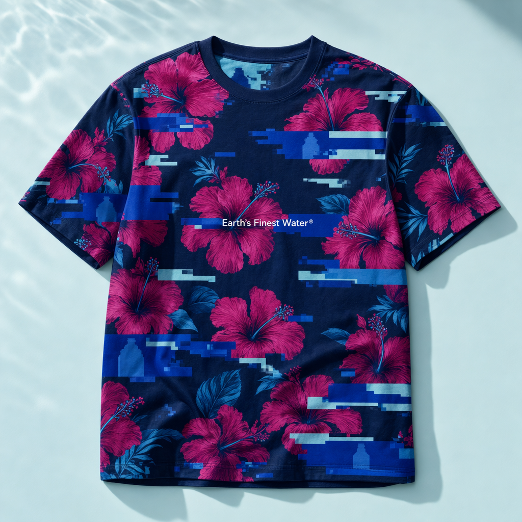 Photorealistic flat-lay of a premium unisex FIJI Water graphic t-shirt, neatly arranged on a clean surface. The tee is soft, midweight cotton with a slightly relaxed, drapey fit, shown from the front, sleeves slightly folded for shape. Base color is deep FIJI navy (#041C2C). All-over hibiscus pattern in FIJI magenta (#E10098) and bright light blue (#00C1D5), petals and leaves rendered with painterly, organic detail to feel lush and tropical, not cartoony. Across the body, the floral artwork is sharply interrupted by a series of rectangular ‘glitch’ blocks in FIJI primary blue (#003DA5) and light blue (#BBDDE6), some blocks offset, some pixelated at the edges, as if the print is digitally corrupted. Within a few of the glitch rectangles, the FIJI square bottle silhouette and cap blue tone appear subtly as abstract shapes, hinting at the iconic bottle without showing a full logo. Center chest, overlaid cleanly on top of the pattern and partially intersecting a glitch bar, the campaign line “Earth’s Finest Water®” appears in small, confident white type, modern sans serif, perfectly registered and crisp. No large chest logo. Finish is high-end screenprint with slightly matte ink; fabric texture and stitching at collar and hem are clearly visible. Lighting is soft natural daylight from upper left, creating gentle shadows and highlighting the richness of the blues and magenta. Background is a smooth ice-blue surface (#BBDDE6) with a faint, out-of-focus suggestion of pool water reflections, keeping the scene relaxed and escapist. Camera framed overhead, full shirt in view with a little breathing room around the edges, no props to keep focus on the design and color story.