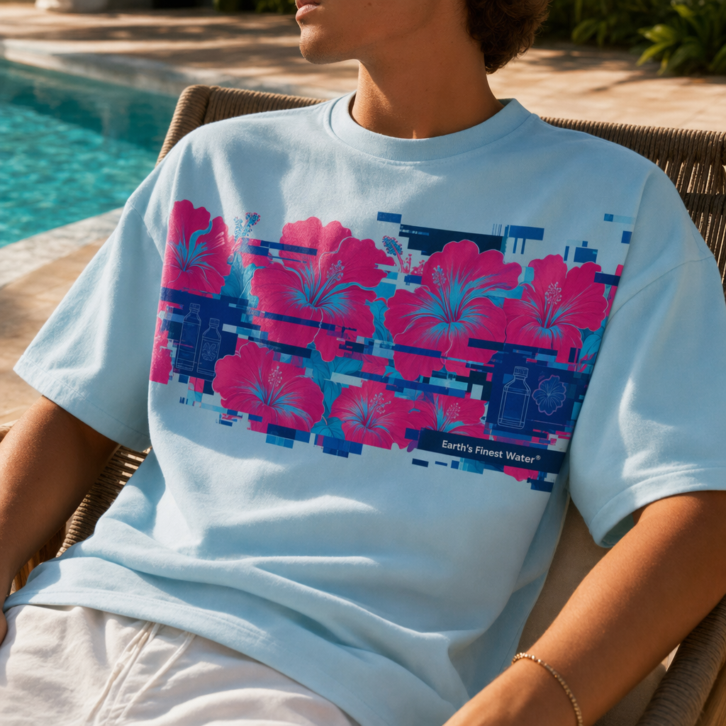 Lifestyle photorealistic image of a person wearing an “Aloha Error Tee” FIJI Water t-shirt in a relaxed resort setting. The tee is a slightly oversized, boxy unisex cut made from premium, soft organic cotton, shown from the front at mid-torso crop while the wearer lounges sideways in a woven lounge chair near a pool. Base color of the shirt is light FIJI blue (#BBDDE6), giving an airy, coastal feel. The main graphic is a band of dense hibiscus florals wrapping across the chest and upper torso, rendered in FIJI magenta (#E10098) with shading in bright light blue (#00C1D5), petals overlapping in a lush, layered tropical print. Cutting through this floral band are multiple horizontal and vertical rectangular glitch blocks in primary FIJI blue (#003DA5) and deep navy (#041C2C), some semi-transparent, some fully opaque, with slight pixel fragmentation at the edges to create a tropical-meets-tech aesthetic. Inside a few of these blocks, subtle line-art of the FIJI square bottle and a hibiscus icon flicker as if part of a glitched UI, understated and tonal. Near the lower right of the graphic, aligned with a navy glitch bar, the phrase “Earth’s Finest Water®” appears in small, confident white sans serif type, integrated like a clean system label rather than a slogan lockup. Print finish is crisp and smooth, slightly luminous against the matte cotton. Lighting is golden-hour sunlight, warm and soft, creating gentle highlights on the folds of the shirt and a relaxed, vacation mood. Background is softly blurred: hints of turquoise pool water, pale stone deck, and a touch of greenery, no clutter or other branding. Camera angle is three-quarter, slightly above, focusing on the torso and design while keeping the face mostly out of frame for an inward, personal feel.