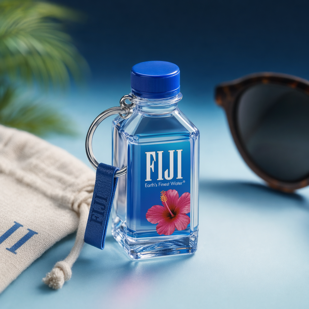 Photorealistic studio render of a FIJI Water luxury keychain charm designed as an ultra-miniature, crystal-clear FIJI bottle. The tiny bottle is perfectly square with beveled edges, translucent PET-like plastic, filled with clear water, and a glossy FIJI blue label with magenta hibiscus artwork, plus the line “Earth’s Finest Water®” subtly printed in white. The cap is FIJI cap-blue with a satin sheen. Attached to the bottle neck is a brushed stainless steel keyring and a slim FIJI-blue leather loop tab, debossed with a small vertical FIJI wordmark. Overall finish feels like affordable luxury, not flashy: high-quality materials, tight tolerances, no visible seams. Lighting is soft and cinematic, with cool FIJI blues and a hint of magenta reflection, creating tiny specular highlights on the water and plastic. Background is a smooth gradient from deep navy (#041C2C) at the top fading into light ice blue (#BBDDE6) at the bottom, with a faint, out-of-focus island foliage texture that evokes relaxation and escape but remains minimal. Camera is a close-up macro shot at slight three-quarter angle, shallow depth of field, focusing sharply on the mini bottle and label details, with a few blurred everyday objects (a linen pouch and sunglasses) at the edges of the frame to suggest an elevated daily ritual carry, not nightlife or sports.