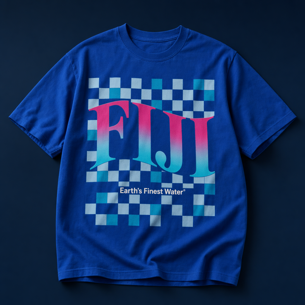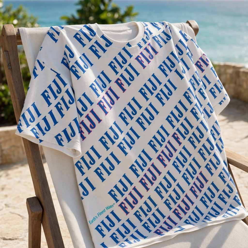 Photorealistic studio shot of a unisex premium FIJI Water graphic T‑shirt laid flat on a seamless background. The tee is soft, heavyweight cotton with a relaxed, slightly boxy fit and a thick ribbed collar, conveying affordable luxury and everyday comfort. The base fabric is a clean, bright white. Across the entire body and sleeves, there’s an all‑over diagonal repeat pattern of the word “FIJI” set in tall collegiate serif type, running from bottom-left to top-right. The type is oversized and slightly warped, as if inspired by a plush hotel carpet pattern, creating a playful, trend-forward “carpet tee” effect. Letterforms are rendered in rich primary FIJI blue (#003DA5), with subtle tonal variation and micro-texture to feel like high-end screen print or discharge print that’s soft to the hand, not plasticky. Between some diagonals, a faint, ultra-thin magenta (#E10098) shadow or outline peeks along one side of the letters to introduce FIJI’s signature blue + magenta pairing without feeling loud. On the left chest, barely interrupting the pattern, a small, clean lockup reads “Earth’s Finest Water®” in white reversed out of a tiny FIJI blue rectangular block, positioned so it feels like a considered fashion label rather than a logo stamp. Lighting is soft, diffused daylight with a slight cool temperature, creating gentle shadows in the fabric folds and emphasizing the premium knit texture. Background is a smooth, pale ice-blue surface (#BBDDE6) that subtly gradients to slightly darker FIJI blue at the top edge, nodding to the bottle’s aquatic gradient and the idea of relaxation and escape. Camera is top-down, framed to show the full shirt with a slight offset crop, with a pair of minimalist silver-framed sunglasses and a folded hibiscus-pink towel partially in frame at the edge to hint at a laid-back beach day ritual. Overall mood: iconic, authentic, effortless, playful, more fashion than merch, clearly something only FIJI would make.