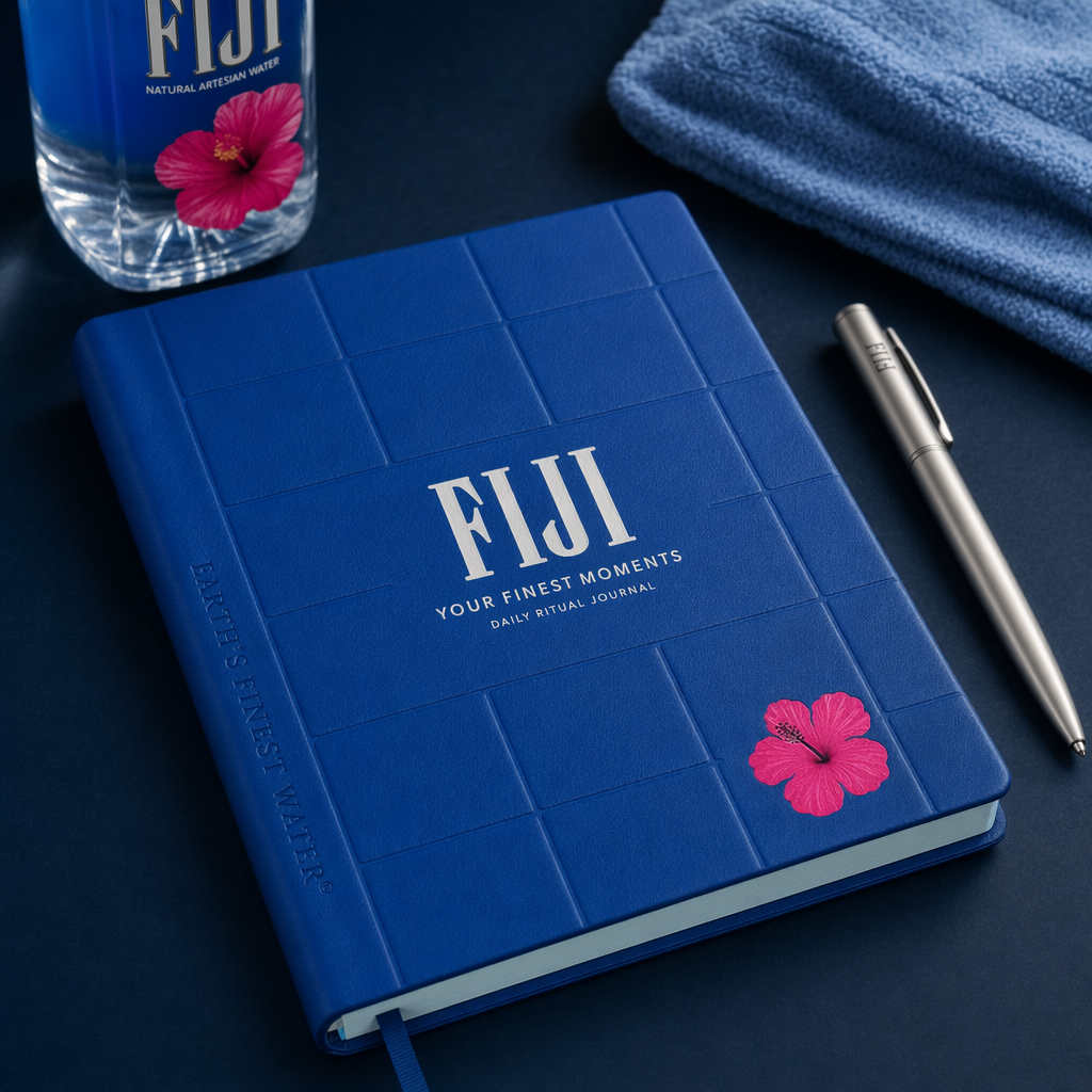 Photorealistic product flat-lay of a FIJI Water “Your Finest Moments” daily ritual journal, closed, shot from a top-down camera angle on a clean navy (#041C2C) surface. The journal cover is wrapped in soft-touch vegan leather in primary FIJI blue (#003DA5) with a subtle, debossed square grid pattern inspired by the FIJI bottle shape across the surface. In the lower right corner, a small, elegant magenta (#E10098) hibiscus icon is foil-stamped, with “Earth’s Finest Water®” blind-debossed along the spine, tone-on-tone for a quiet, premium feel. Edges of the pages have a faint ice-blue (#BBDDE6) tint when viewed from the side, suggesting water and relaxation. Lighting is soft, diffused daylight from upper left, creating gentle highlights on the leather texture and soft shadows around the journal. In the background, slightly out of focus, are calm lifestyle cues: a FIJI bottle, a minimal pen in brushed silver, and a folded soft blue cotton towel, reinforcing an everyday wellness ritual without feeling staged. No harsh reflections, no clutter, mood is calm, laid-back, and aspirational but attainable.