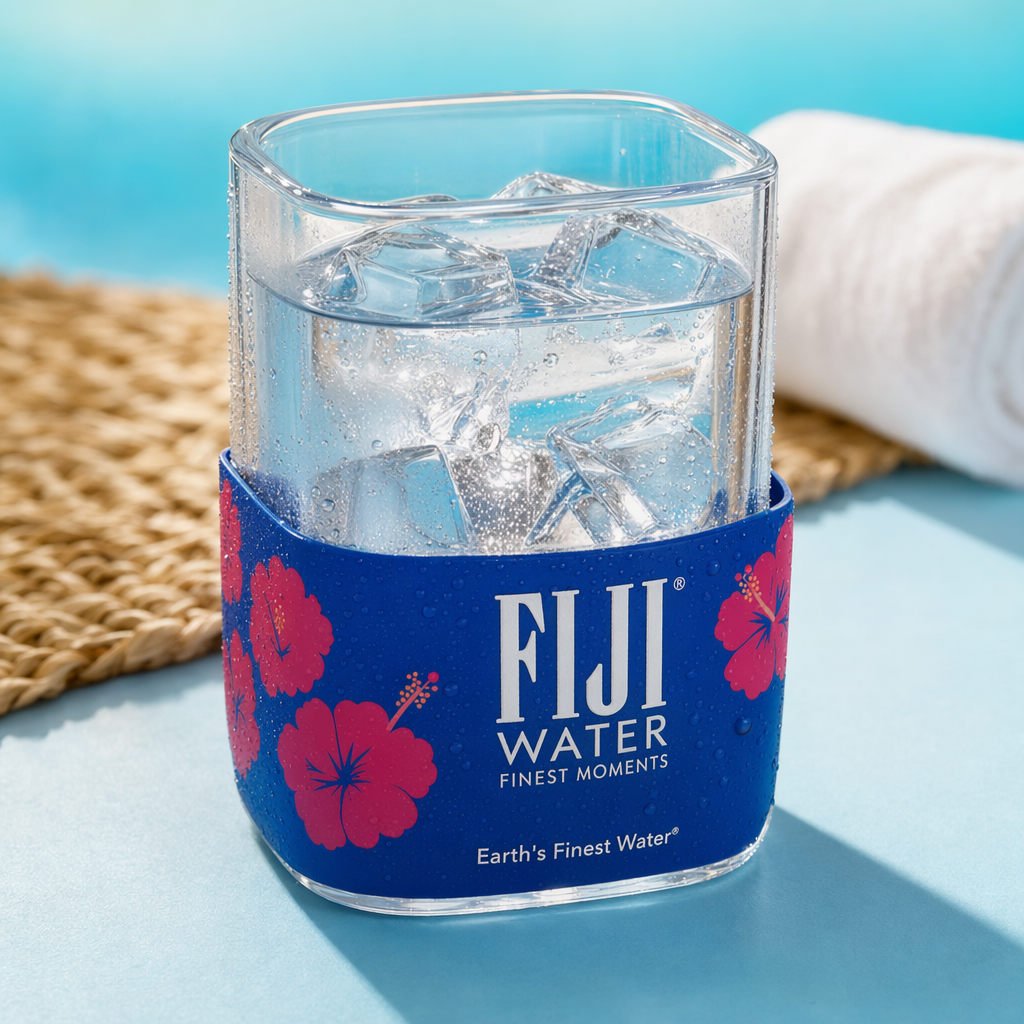 Photorealistic close-up of a FIJI Water “Finest Moments” double-walled glass tumbler on a light blue (#BBDDE6) background with a soft gradient into bright light blue (#00C1D5), evoking a poolside horizon. The tumbler is crystal-clear borosilicate glass with a square outer profile subtly echoing the FIJI bottle, and a smooth cylindrical inner wall. Around the base, a translucent silicone sleeve in FIJI primary blue (#003DA5) wraps about one-third of the height, with a playful magenta (#E10098) hibiscus pattern and a small, confident “Earth’s Finest Water®” line in white. The glass is filled with water and a few ice cubes, with soft condensation beads on the exterior for a refreshing, liquid-luxury feel. Lighting is bright but diffused, like shaded sun at a beach resort, creating crisp reflections along the rim and gentle shadows on the surface. In the softly blurred background, hints of a woven straw mat and a rolled white towel suggest relaxation and escape, not performance sport. Camera framing is three-quarter angle at eye level with the rim, focusing sharply on material clarity and the blue-magenta accents.