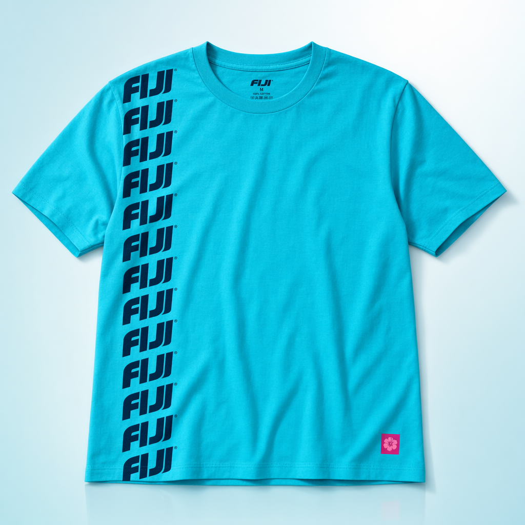 Photorealistic studio shot of a premium unisex streetwear t-shirt laid flat, front side fully visible. The shirt body is a rich, bright cyan close to FIJI bright light blue (#00C1D5), made from midweight combed cotton with a soft, slightly lustrous finish. Design: a bold vertical column of repeating FIJI wordmark logos running from the left shoulder down toward the hem, each logo in deep navy (#041C2C) and evenly spaced like stamped textiles, creating a strong streetwear stripe effect. The logos stay clean and minimal with no extra slogans, emphasizing the iconic mark. On the lower right side near the hem, a small magenta (#E10098) hibiscus icon or tiny square tag adds the signature blue + magenta pairing without feeling loud. Tagless printed neck label in navy for a premium feel. Background: seamless ice-blue gradient backdrop (#BBDDE6 fading to white) with soft diffused studio lighting, mild top-down shadows, and a subtle reflection beneath the tee to emphasize quality fabric texture. Camera: overhead flat lay, slightly wide, showing the full silhouette with some breathing room around the shirt, sharp focus on fabric weave and crisp ink edges.
