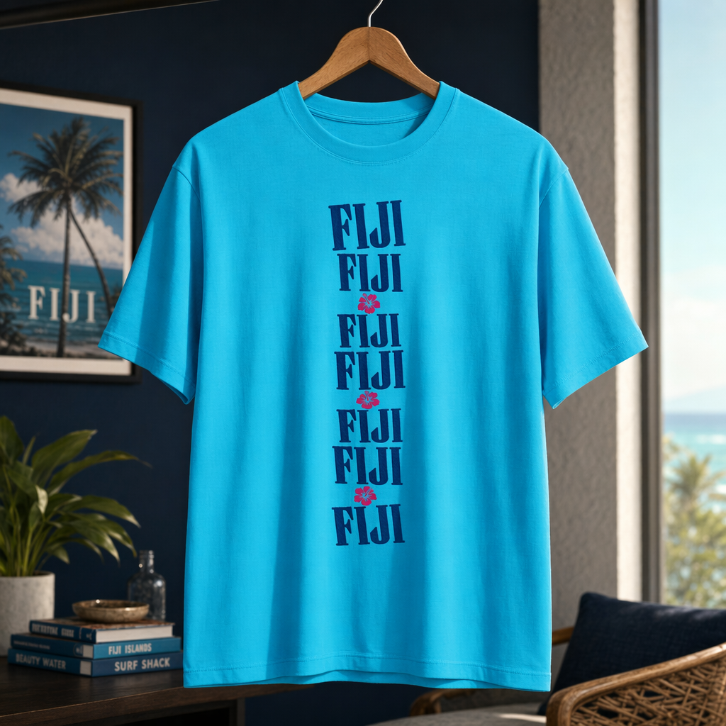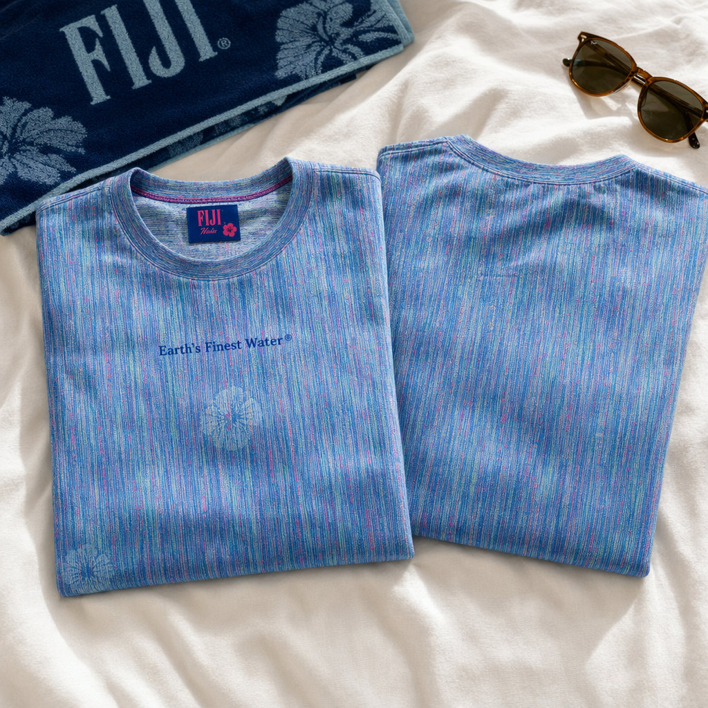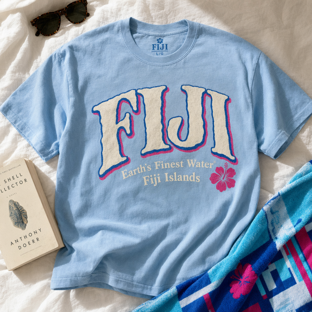 Photorealistic flat-lay of a unisex premium cotton t-shirt called the “Tourist Trap Tee,” styled as a faux island souvenir. The shirt is laid neatly on a slightly rumpled white linen bed, evoking a boutique hotel room in Fiji. Garment color: soft washed PMS 7457 light blue. Center chest graphic: a huge vintage serif FIJI wordmark in cream, set in a classic 70s/80s travel-poster serif, arched slightly like an old tourist tee. Around and beneath it, smaller faux-souvenir text reads “Earth’s Finest Water®” and “Fiji Islands” in a secondary serif, arranged in a loose badge layout. Apply a bold modern twist: thick neon offset shadows on the main FIJI letters in signature FIJI blue (#003DA5) with a second layer of hibiscus magenta (#E10098), slightly misregistered to create playful double-outline shadows. Edges of the type are subtly wavy and distorted, like a heat-haze or old screen print, but still premium and legible. Include a tiny hibiscus icon in magenta by the wordmark. Print is soft-hand screen print, matte, not plastic-looking. Tagless printed neck label shows a small FIJI logo and size, no visible cardboard tags. Lighting: soft, natural window light from the side, with gentle shadows and slight highlight on the ink to show texture. Background styling: a pair of tortoiseshell sunglasses, a paperback book, and a folded FIJI-blue beach towel partially in frame, slightly out of focus, suggesting relaxed travel, not nightlife. Camera: overhead top-down shot, medium distance, capturing the entire tee and a bit of the surrounding scene. Color palette leans heavily into FIJI blue plus magenta accents, clearly evoking the brand without feeling ostentatious or fashion-runway; it feels like an elevated, affordable luxury souvenir that only FIJI would make.