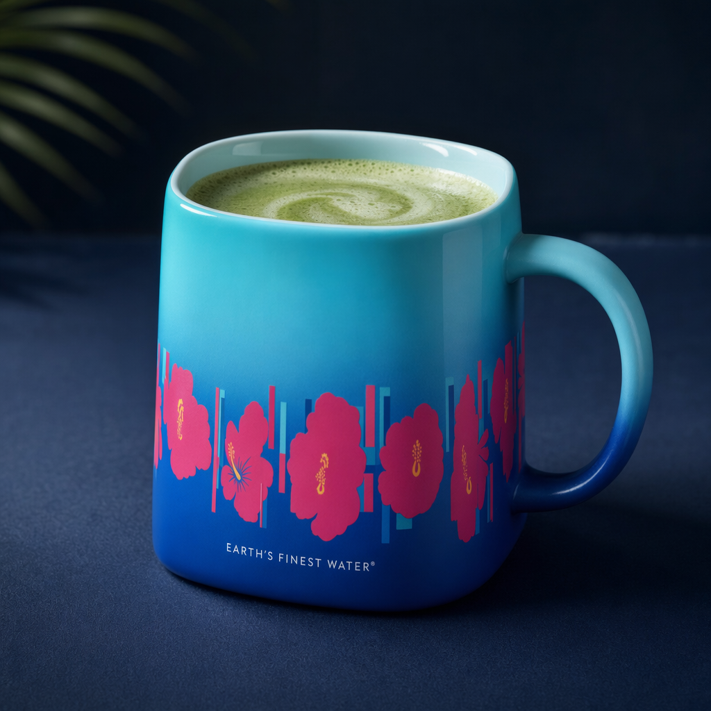 Photorealistic studio mockup of a FIJI Water-inspired premium ceramic matcha mug, designed as an “everyday ritual of escape” object. The mug has a softly squared silhouette that subtly echoes the FIJI bottle shape, with slightly rounded corners and a comfortable, wide handle. High-quality glazed stoneware with a silky, matte exterior and glossy interior. Exterior base color is primary FIJI blue (#003DA5) that gently gradients upward into bright light blue (#00C1D5), with a soft vertical ombré reminiscent of water. Around the center, a band of abstract hibiscus-petal pattern in hibiscus magenta (#E10098) wraps the mug, playful but minimal, integrating a small, tasteful “Earth’s Finest Water®” line in clean white sans serif. Interior glaze is ice-blue (#BBDDE6), suggesting cool water and calm. No large logo; this feels like an elevated, design-forward object you’d want on your desk or bedside table. The mug is filled with a warm green matcha latte with delicate microfoam, a faint swirl visible at the top, suggesting a daily wellness ritual rather than high-energy sports. Lighting is soft, natural window light from the left, with gentle highlights on the glossy rim and subtle reflections in the liquid. Background: a simple, slightly textured navy (#041C2C) surface and backdrop, with a shallow depth of field, a faint out-of-focus palm leaf shadow hinting at tropical escape. Camera angle: 3/4 view at table level, tight framing that heroizes the mug, focusing on the gradient colors and magenta hibiscus details. Photorealism, high resolution, no people, no sports cues, mood is laid-back, cool, quietly luxurious.