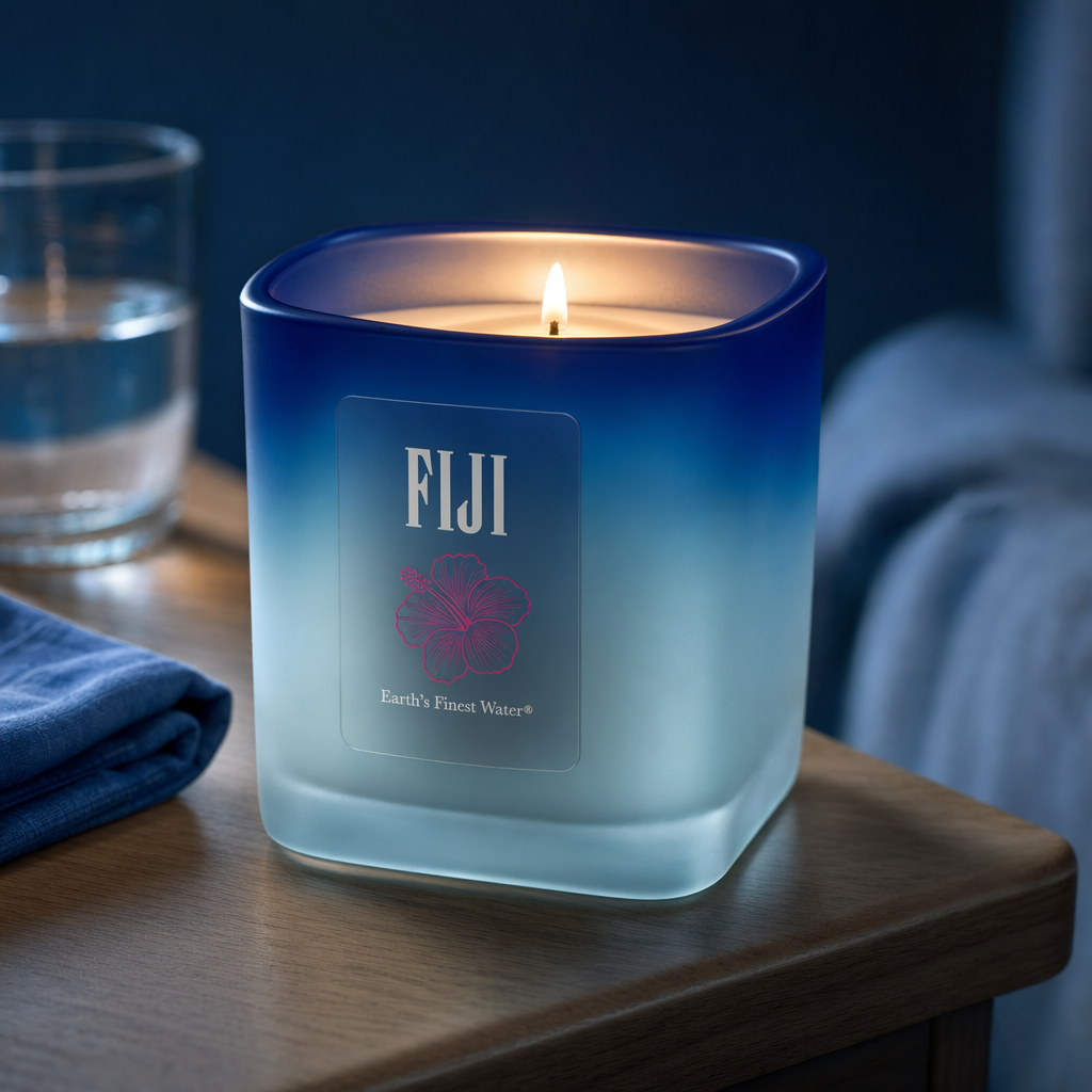 Photorealistic lifestyle mockup of a FIJI Water-branded soft-touch aromatherapy candle, positioned as an “Earth’s Finest Moments” evening ritual object. The candle is in a thick, frosted glass vessel with a subtly squared cylinder profile, echoing the FIJI bottle’s iconic square form but softened at the edges. Glass exterior features a vertical gradient from light blue (#BBDDE6) at the base to FIJI blue (#003DA5) near the rim, with a translucent quality that allows the warm candle glow to tint the blues. A minimal, debossed-feel label in semi-matte clear film sits on one side: a small FIJI wordmark, a delicate line-drawn hibiscus in hibiscus magenta (#E10098), and the line “Earth’s Finest Water®” in fine white type. The wax is natural off-white with a single clean cotton wick, slightly melted in the center from being lit. Flame is small and steady, casting soft, cozy reflections on the inner glass. Surrounding environment: a low, light-wood bedside table with a subtle grain, a folded blue linen napkin, and a barely-visible glass of water in the background, out of focus. Background is a blurred gradient wall in navy (#041C2C) fading into deep teal, suggesting a calm bedroom or hotel vibe. Lighting is a mix of the candle’s warm, golden glow and a faint cool ambient light from outside frame, creating a balanced, emotionally rich, relaxing mood. Camera angle: close-up macro-style shot from slightly above, focusing on the vessel’s glass texture, gradient colors, and the interplay of warm light inside cool blue glass. Absolutely no clutter, no party or club vibe, just elevated, affordable luxury for a nightly wind-down ritual.