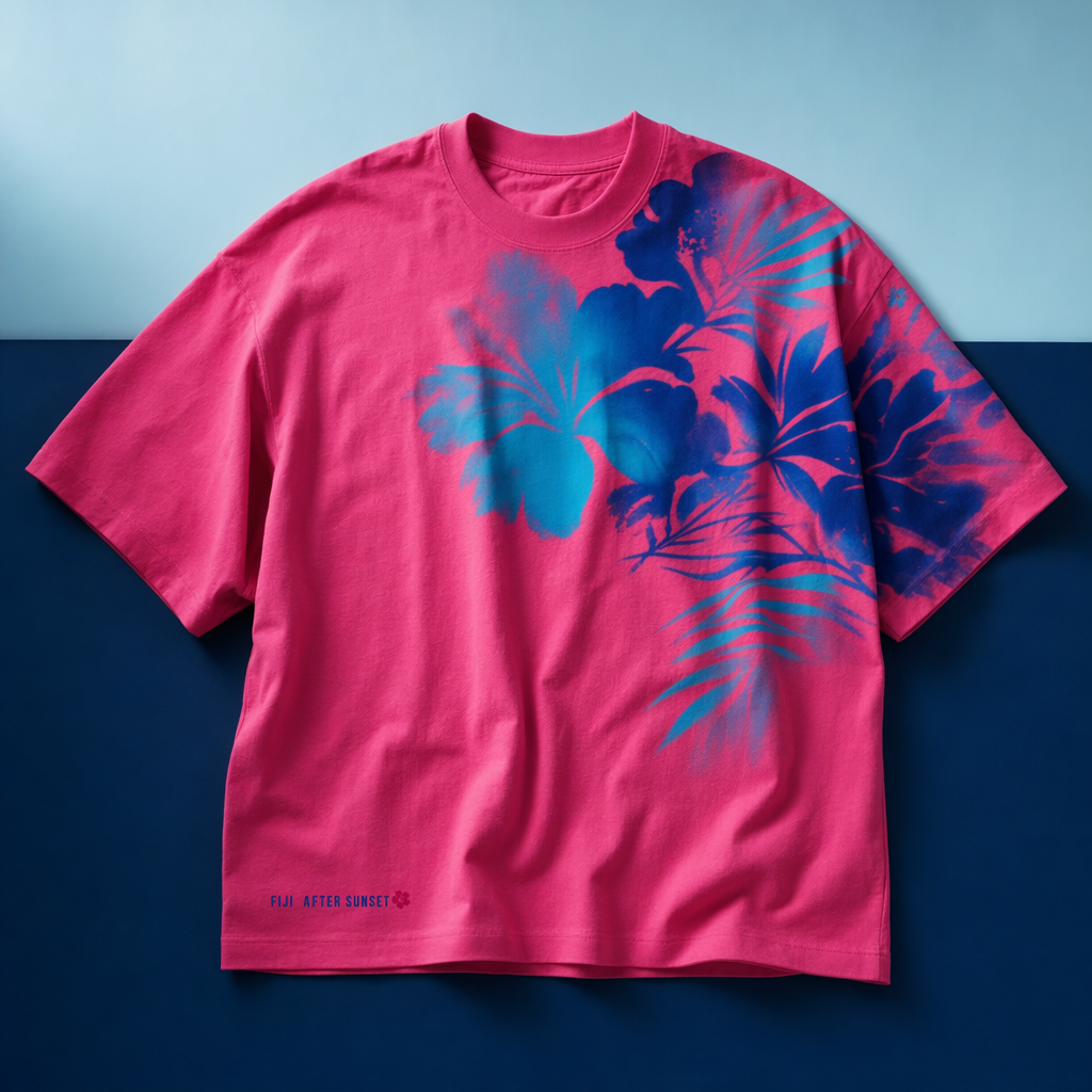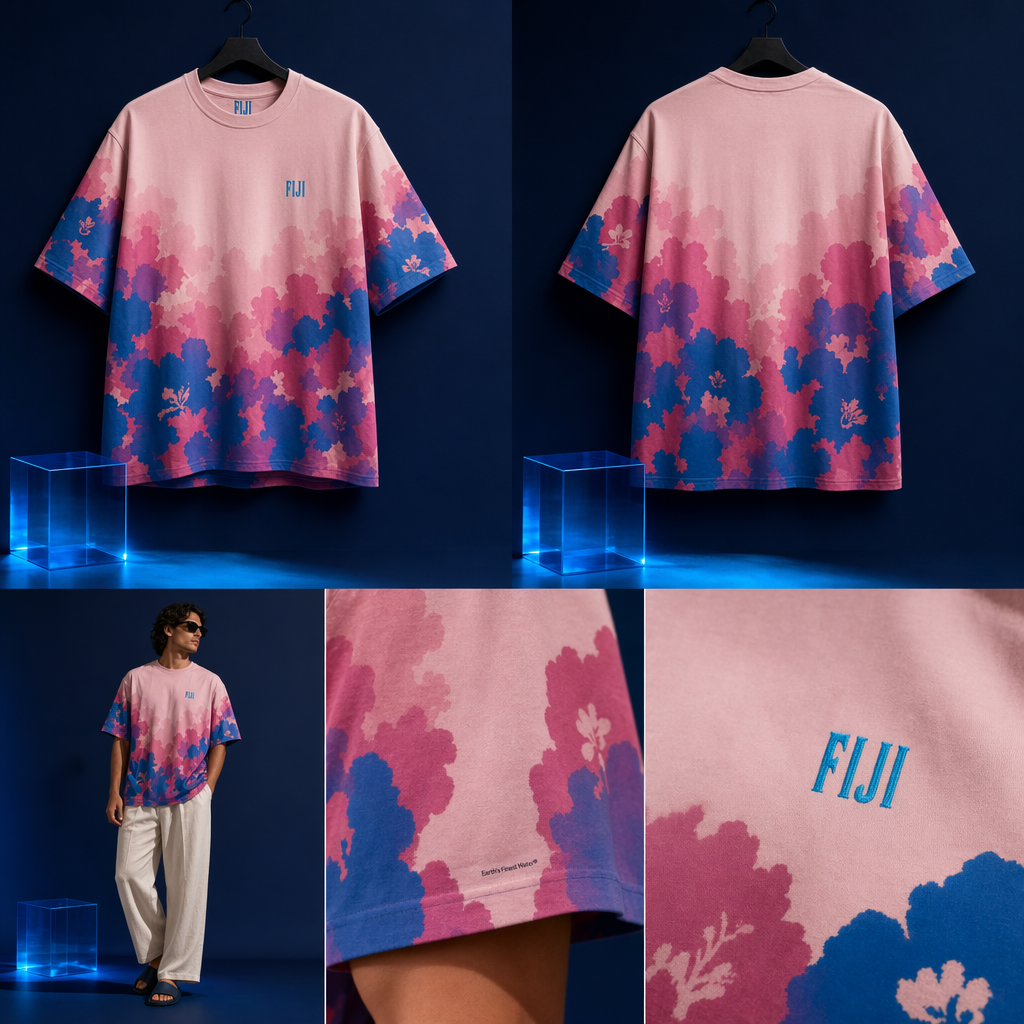 Photorealistic fashion-forward mockups of a "Pink Noise Floral Tee" reimagined through a bolder graphic lens. Relaxed boxy tee in ultra-soft organic cotton jersey, base color a calm, dusty blush pink. Across the tee, place irregular oversized floral "noise" shapes in saturated hibiscus magenta and FIJI primary blue, overlapping and bleeding into each other like abstract sound waves or ink clouds in water. The blobs should cluster more densely around the hem and sleeves and softly fade toward the chest to create a breathable space for a tiny, minimal FIJI wordmark in bright cyan, printed or embroidered at left chest, no outline, no slogan. Incorporate subtle negative-space hibiscus silhouettes inside some blobs to make the pattern feel distinctly FIJI, not generic floral. On one sleeve cuff, add a micro tag or micro print reading "Earth’s Finest Water®" in navy, very discreet. Surface finish: high-quality matte print that feels integrated with the fabric, not plasticky. Lighting: editorial yet relaxed, soft side lighting with a faint cyan and magenta color cast, as if reflecting pool water and sunset. Background: deep navy studio backdrop with a pool of FIJI blue light on the floor, a translucent acrylic cube in FIJI blue in the scene for a subtle square-bottle nod. Camera: front and back on hanger against the navy wall, one three-quarter angle on a model styled with loose linen trousers and slides, plus a close-up of sleeve tag and print detail, all conveying effortless, trend-setting relaxation rather than hype-streetwear.