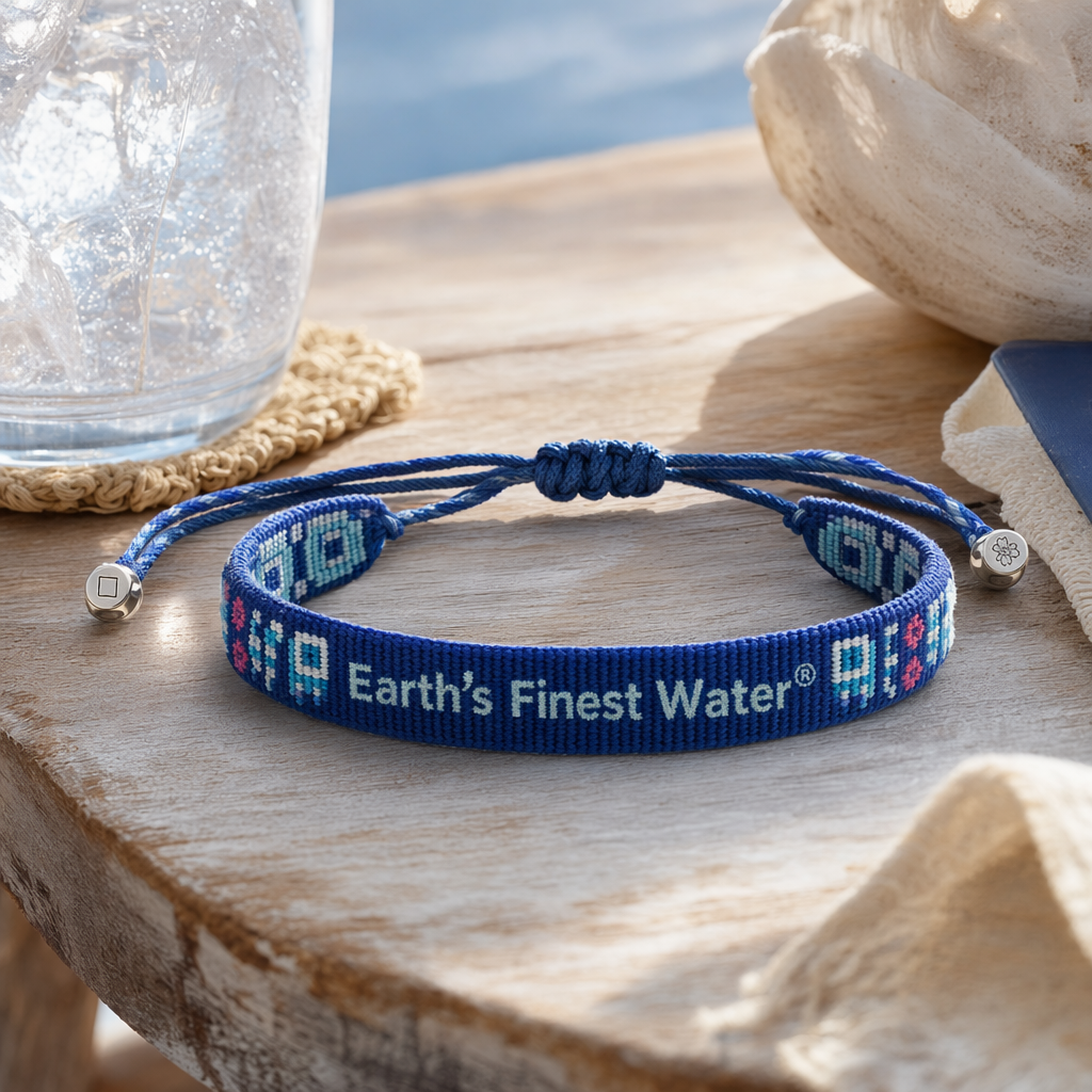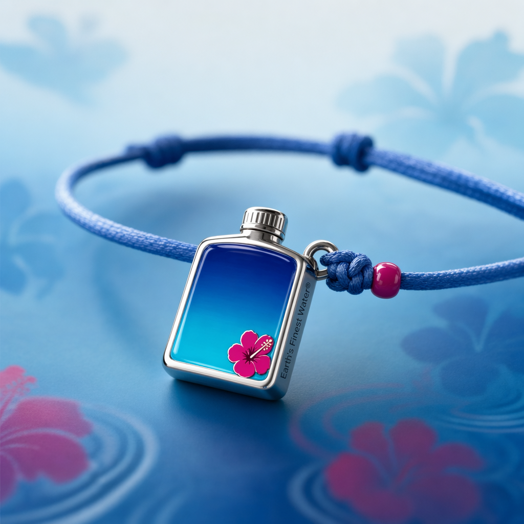 Photorealistic studio render of a FIJI Water inspired minimalist bracelet charm shaped like a small square FIJI water bottle icon, designed as affordable luxury jewelry for everyday ritual. The charm is cast in polished stainless steel with soft rounded edges, front face filled with a glossy enamel gradient from deep FIJI blue (#003DA5) at the top to bright light blue (#00C1D5) at the bottom, like the FIJI label field. A tiny hibiscus icon in vivid magenta (#E10098) is in the lower corner of the square, with the words “Earth’s Finest Water®” engraved subtly along the edge in a refined, modern sans-serif font. The charm hangs on a thin, silk-like adjustable cord in cornflower electric blue, with a small magenta enamel bead near the knot – playful but not flashy. Surface finish is clean and premium, no visible defects. The scene is lit with soft natural daylight from the left, creating gentle highlights on the metal and a relaxed, calm mood. Background is an out-of-focus gradient field from light blue (#BBDDE6) at the top to navy (#041C2C) at the bottom, with a faint, abstract hibiscus-and-ripple pattern in blue and magenta to hint at water and escape. Camera framing: close-up macro shot from a 3/4 angle, charm centered, cord gently curving across the frame, shallow depth of field so only the charm face is razor sharp. No other logos, no people, no text in the background, pure focus on the object as a small, personal FIJI moment.