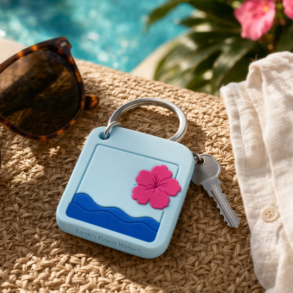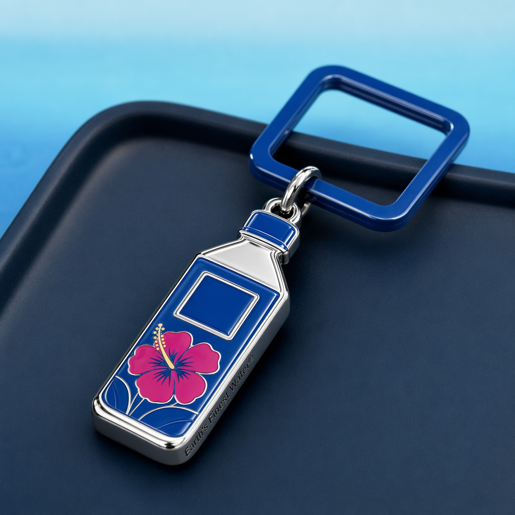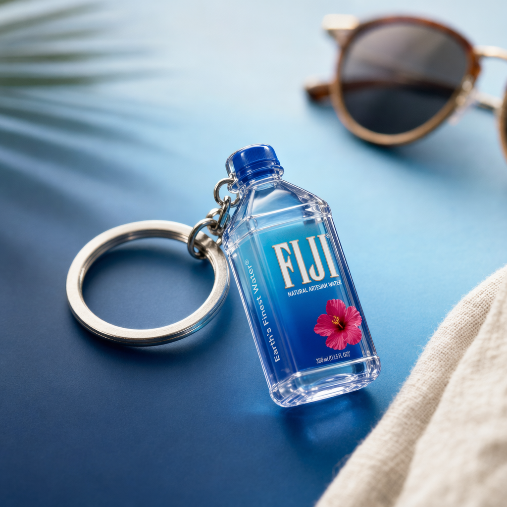 Photorealistic FIJI Water premium keychain charm, designed as a tiny, perfectly detailed FIJI square bottle in clear polished acrylic, filled with a faint FIJI blue tint to mimic water. The miniature label uses signature FIJI blue (#003DA5), bright light blue gradient (#00C1D5), and hibiscus magenta (#E10098), with a small magenta hibiscus icon and the campaign line subtly printed on the side: “Earth’s Finest Water®”. The charm is attached to a brushed satin-finish silver key ring with a clean, minimal look—no bulk, no clutter—evoking affordable luxury and everyday ritual (keys, gym bag, beach tote). Soft studio lighting with gentle reflections emphasizes the clarity of the acrylic and the smooth edges, with a dreamy gradient background moving from navy (#041C2C) at the bottom to light blue (#BBDDE6) at the top, plus a subtle out-of-focus palm leaf shadow to suggest tropical escape. Camera framing is a close-up three-quarter angle on the keychain lying on a flat surface with a shallow depth of field, focusing on the bottle charm and its blue-magenta color pairing, with a pair of casual but well-made sunglasses and a linen fabric edge blurred in the background to suggest a laid-back, well-traveled lifestyle.