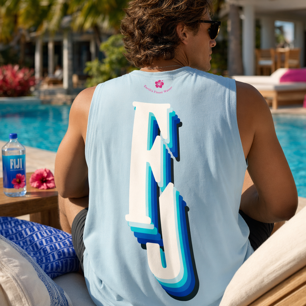 Photorealistic lifestyle mockup of a FIJI Water “Rotated Wordmark Repeat Tee” styled through a fashion lens on everyday relaxation. Premium slightly oversized unisex tee in FIJI cornflower electric blue (#005EB8 range), worn by a casually well-dressed model lounging on a sunlit terrace with soft-focus palm trees and ocean hints in the background. All-over pattern: FIJI wordmark tiled sparsely across the front and sleeves, each instance either vertical or horizontal, creating a playful checkerboard of orientations. Colorway: lighter cyan (#00C1D5) and deep FIJI blue (#003DA5) for the wordmarks, with occasional magenta (#E10098) micro “dot” accents placed at some intersections to subtly echo the hibiscus without a literal flower. One vertical column of FIJI wordmarks runs cleanly down the left side seam like a fashion side-stripe. Back view in a secondary shot: centered, understated “Earth’s Finest Water®” line rotated vertically along the spine in primary blue, surrounded by a few rotated FIJI wordmarks in cyan. Fabric has a slightly silky, high-count cotton look with a luxe drape; ink is flat and opaque, no shine. Lighting is warm late-afternoon sun with gentle shadows, capturing texture in the shirt and making the blues pop; background palette stays in soft navy and light blue with hints of magenta beach towel to reinforce brand colors. Camera: mid-shot from waist up plus close-up of shoulder and chest area to show rotation of the wordmarks and precise print registration. Mood: effortless vacation escape, relaxed, personal everyday ritual rather than performance sportswear.