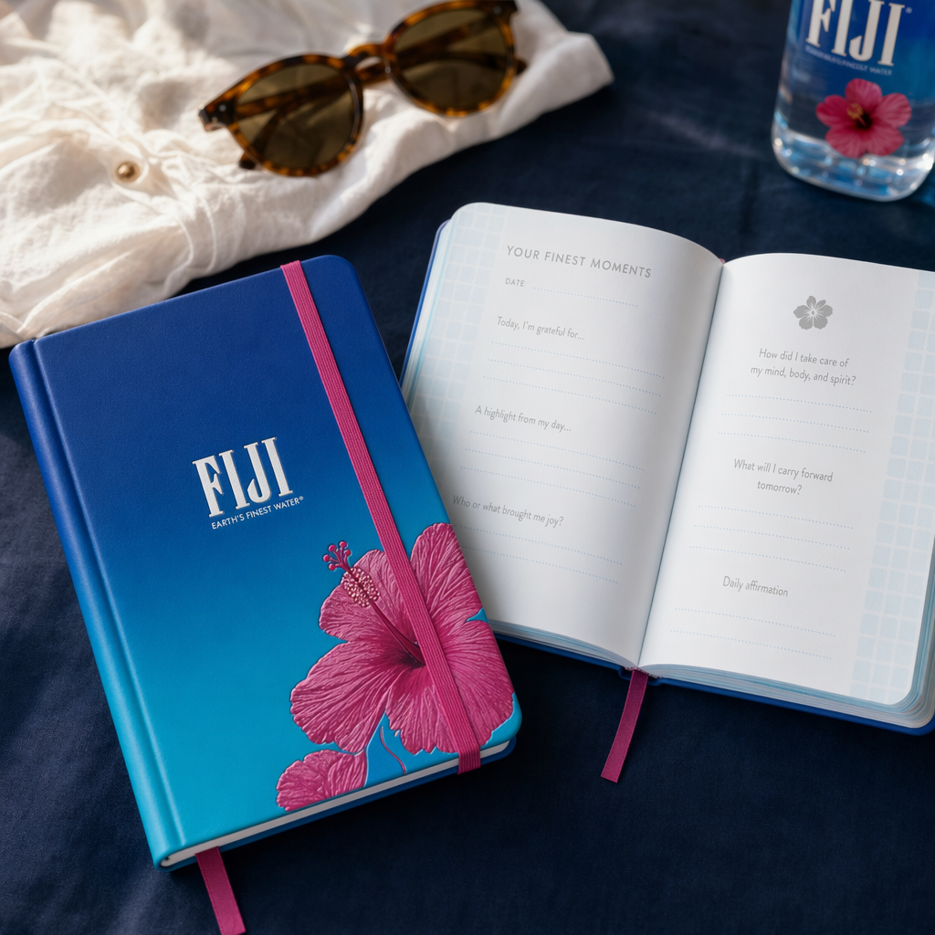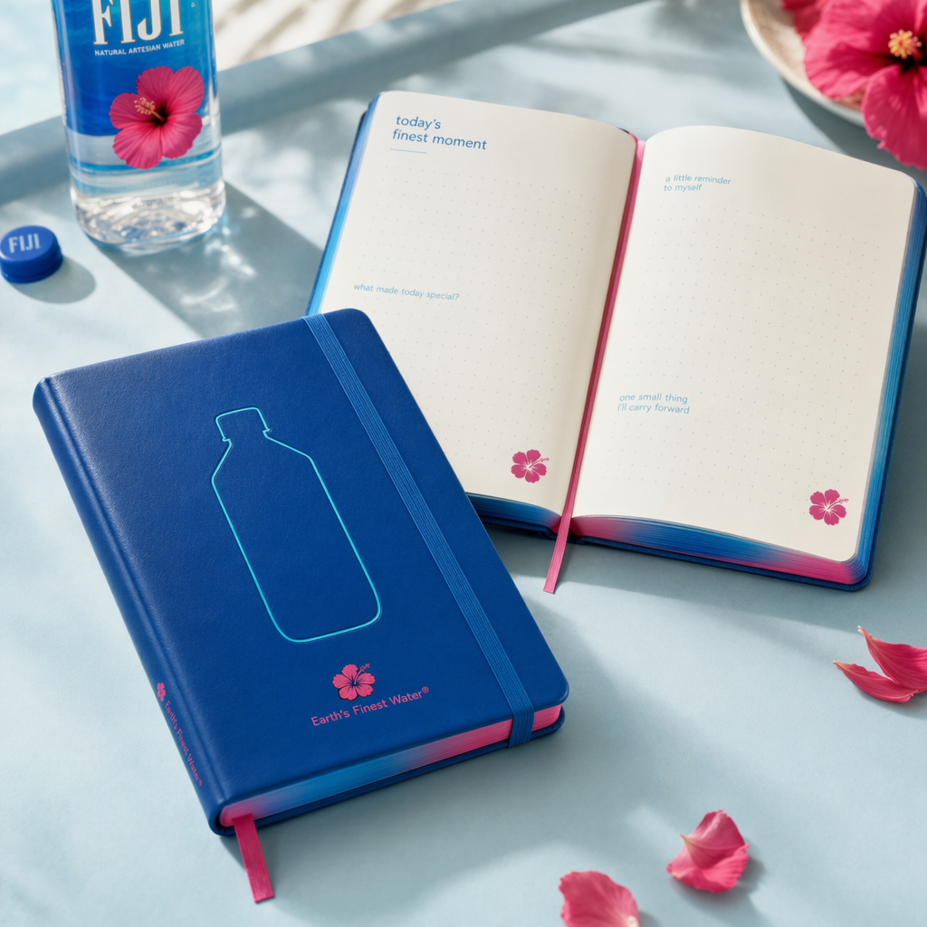 Photorealistic product shot of a FIJI Water "finest moments" ritual journal closed and open on a light, spa-like tabletop. The journal cover is a smooth, slightly padded vegan leather in rich FIJI primary blue (#003DA5), with a subtle satin sheen. Centered on the cover is a debossed FIJI square-bottle silhouette outline in bright light blue (#00C1D5), with a small hibiscus icon and the line “Earth’s Finest Water®” stamped in understated hibiscus magenta (#E10098) at the bottom. No large logo lockup, just small, confident branding on the spine and back. Edges of the pages are gradient-dyed from FIJI blue into magenta, echoing the bottle’s blue-to-pink world. Inside pages are creamy off‑white with a light cyan dot‑grid and small, playful prompts like “today’s finest moment” in a refined sans serif. Include a slim elastic closure band in FIJI blue and a matching ribbon bookmark in magenta peeking out. Lighting is soft daylight, like late morning in a beach bungalow: gentle window light from the left, crisp but not harsh, casting soft shadows. Background: pale ice blue surface (#BBDDE6) with out-of-focus hints of a FIJI bottle and hibiscus petals in the background, giving a sense of relaxed escape. Camera angle: 3/4 top-down view, hero focus on cover texture and page edges, shallow depth of field for a premium, editorial feel.