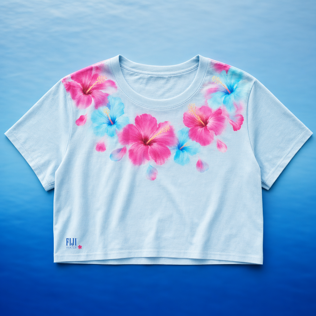 Photorealistic studio shot of a women’s cropped t‑shirt laid flat on a clean surface, styled as premium but relaxed lifestyle merch for FIJI Water. The tee is soft, mid‑weight organic cotton with a slightly boxy, modern cropped fit, crew neckline, and clean hems. Fabric color is a cool FIJI light blue (close to PMS 7457/3115) that feels like an ice‑blue sky. Around the front collar, print a loose necklace of oversized hibiscus flowers and petals, forming a digital lei that follows the neckline: petals are in hot hibiscus magenta and bright aqua, with subtle gradients and soft edges so it feels like a digital glow rather than flat clip art. The lei is playful and not perfectly symmetrical, some petals drifting slightly down the chest. At the lower left hem, add a tiny, tasteful FIJI Water wordmark in primary FIJI blue with a small magenta accent, very minimal. Overall vibe is laid‑back luxury, well‑traveled, beachy escape. Lighting is soft, diffused daylight from a large window, with gentle shadows to show the shirt’s texture and drape, no harsh reflections. Background is a seamless ice‑blue to navy gradient (PMS 7457 fading into PMS 296) with a very subtle out‑of‑focus water ripple texture, to echo liquid luxury without distracting from the tee. Camera is top‑down, framed to show the full tee with a small border of background, high resolution, ultra‑realistic fabric texture and screenprint detail.
