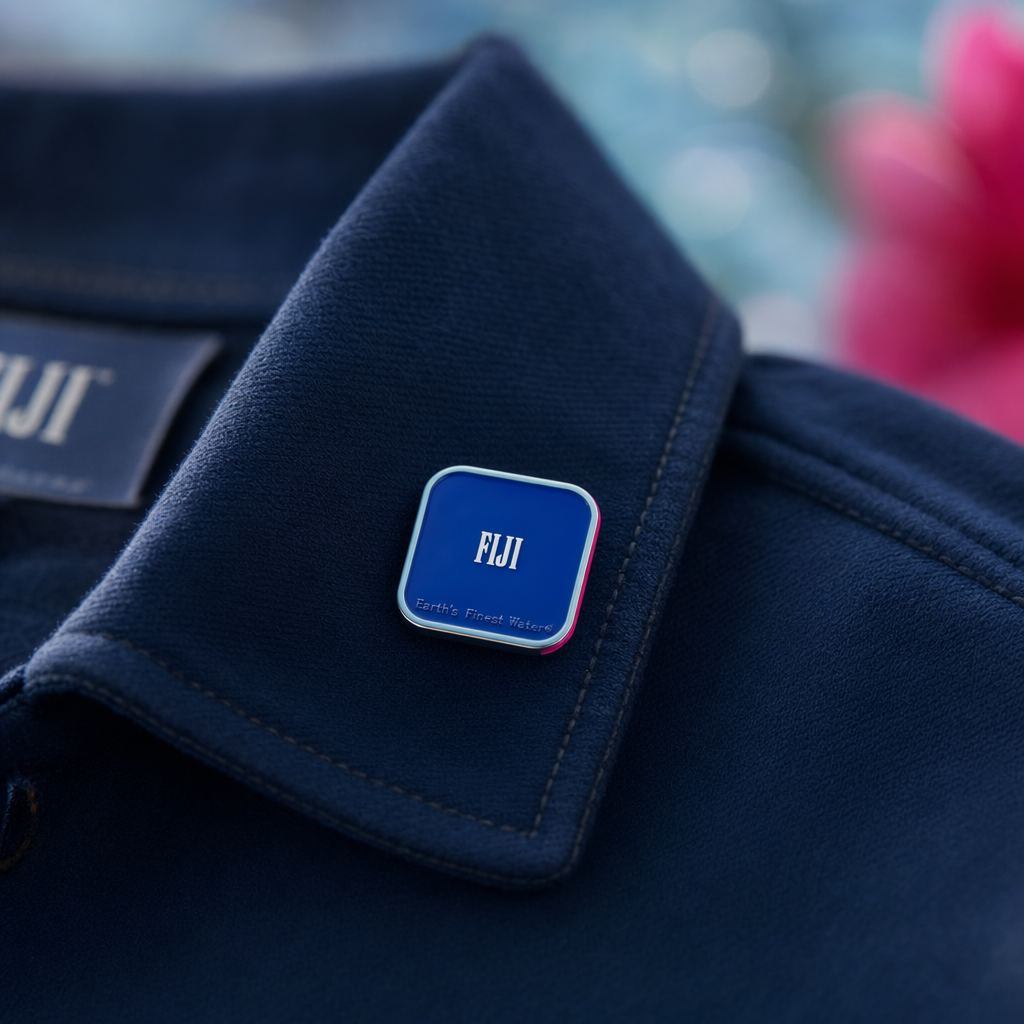 Photorealistic product shot of a minimal FIJI Water enamel pin designed as a small, square dot symbol – a tiny, perfectly rounded square “∙” — representing a quiet pause in your day. The pin is hard enamel with glossy finish: front face in rich FIJI primary blue (#003DA5) with a subtle ice-blue (#BBDDE6) halo around the edge, and a micro hibiscus-pink (#E10098) edge detail barely visible from the side for a playful reveal when tilted. In the center, in crisp white, the tiny FIJI logomark sits subtly, with the campaign line “Earth’s Finest Water®” engraved tone-on-tone along the pin’s lower edge, only catching light at certain angles. The metal hardware is polished silver. The pin is photographed on a soft, folded navy (#041C2C) cotton shirt collar as if casually set down after a beach day, with a shallow depth of field, natural window light, gentle highlights and soft shadows. Background is blurred in cool blues with a hint of magenta bokeh, evoking ocean light and relaxation. Camera is a close, 3/4 macro angle emphasizing enamel gloss, edge detailing, and the affordable-luxury craftsmanship, no clutter, calm aspirational mood.