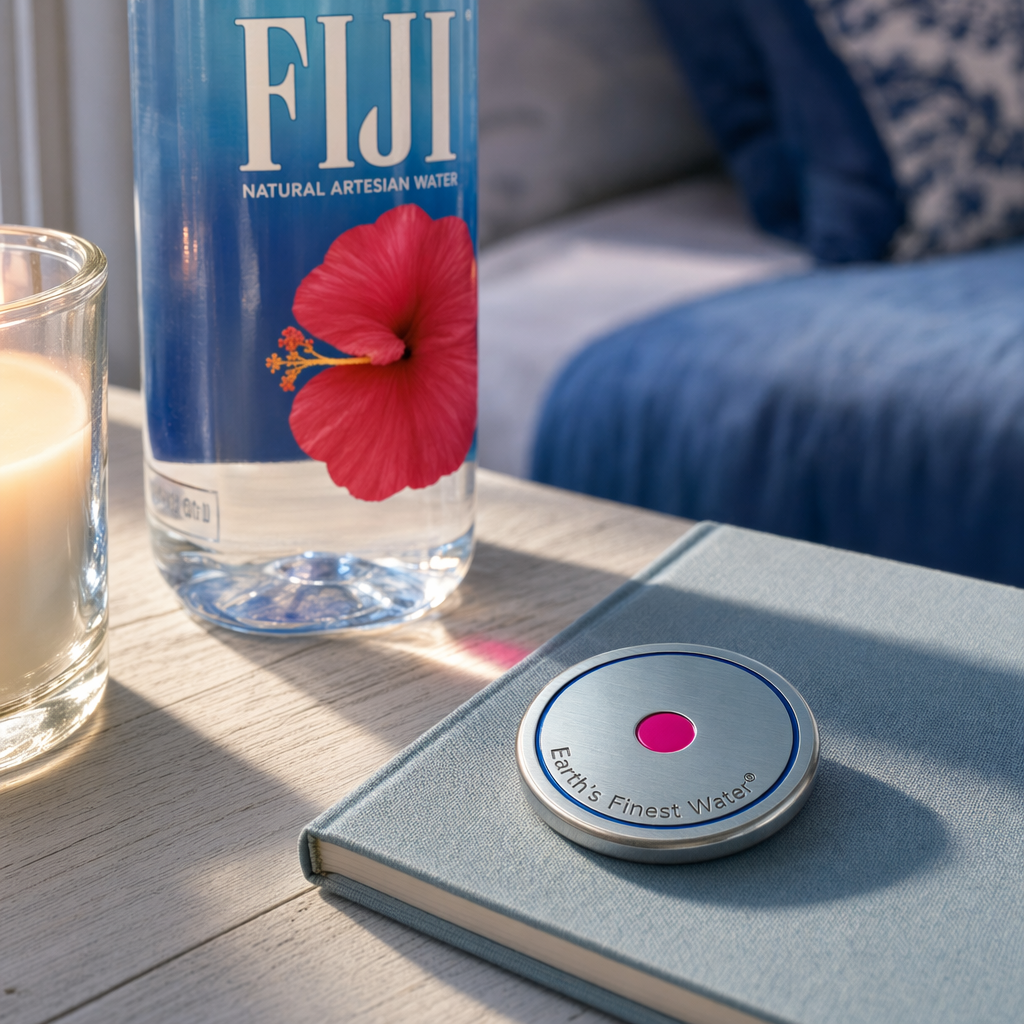 Photorealistic lifestyle shot of a FIJI Water ritual token coin based on the simple “∙” symbol, designed as a personal, everyday relaxation ritual object. The coin is a small, smooth, rounded metal disc about the size of a quarter, with softly beveled edges and premium weight. One side features an engraved central dot symbol recessed and filled with glossy hibiscus magenta (#E10098), encircled by a thin FIJI blue (#003DA5) ring and the subtle phrase “Earth’s Finest Water®” debossed along the perimeter. The rest of the surface is brushed ice-blue metal (#BBDDE6) for a soft, calming sheen. The coin rests on a light blue (#BBDDE6) linen journal placed on a whitewashed wooden bedside table, next to a partially visible square FIJI bottle and a softly lit candle, suggesting a wind-down moment. Morning or golden-hour side light comes through an off-frame window, casting gentle, elongated shadows and a slight magenta reflection onto the table. Background is softly blurred bedroom elements in navy and blue tones, evoking escape and wellness without feeling staged or ostentatious. Camera is a close-up 45-degree angle that shows the engraved text catching the light and the colorful blue + magenta pairing, emphasizing material quality and tactile appeal.