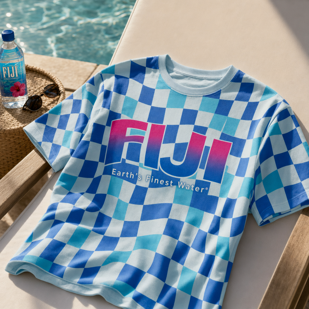 input: 17. FIJI Wave Grid Tee — Blue checkerboard base with warped FIJI text bending like ocean waves across the front.