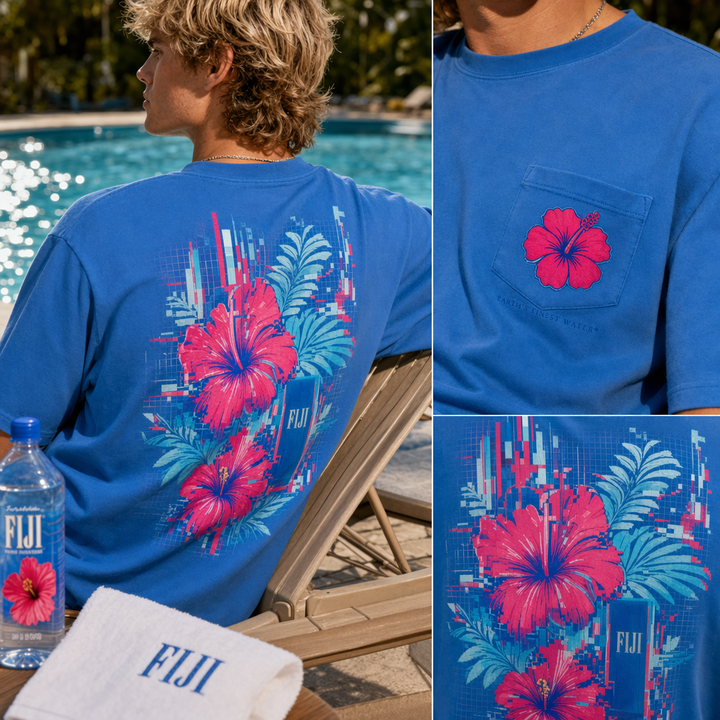 Photorealistic lifestyle render of a unisex FIJI Water “Neon Hibiscus Pocket Tee” worn by a relaxed model at a sunlit poolside resort, capturing FIJI’s laid-back, well-traveled vibe. T-shirt: soft premium cotton jersey in a saturated cornflower / FIJI blue (between #003DA5 and #00C1D5), slightly oversized with dropped shoulders and a relaxed drape. Front: clean left chest pocket with a small, sharp hot pink hibiscus icon in Rhodamine magenta (#E10098), with a subtle neon-outline effect; beneath the pocket’s opening, a discreet tonal blue ‘Earth’s Finest Water®’ wordmark, barely visible unless close. Back: bold oversized glitch floral print from shoulder to mid-back, featuring layered hibiscus and tropical leaves with digital distortion lines and pixel breaks. Colors: primary FIJI blue base, layered with bright light blue (#00C1D5), ice blue (#BBDDE6), and hibiscus magenta; integrate faint square grids and a vertical blue rectangle echoing the FIJI bottle silhouette inside the composition, as if the florals are “blooming” out of the square. Overall aesthetic: playful but refined, like a limited-edition boutique tee. Lighting: golden-hour natural light, warm but balanced, with soft highlights on the fabric folds, shimmering turquoise pool water in the background creating bokeh reflections that echo the blue palette. Background: slightly out-of-focus pool deck with pale stone, a FIJI bottle on a side table, a white towel, and tropical greenery to reinforce the escape/relaxation territory. Camera: medium 3/4 back view of the model seated on a lounge chair so the back glitch print is hero, with a secondary angled close-up crop of the pocket area. Emphasis on rich color contrast between FIJI blue and neon magenta, and realistic print texture that feels high-end streetwear, not basic merch.