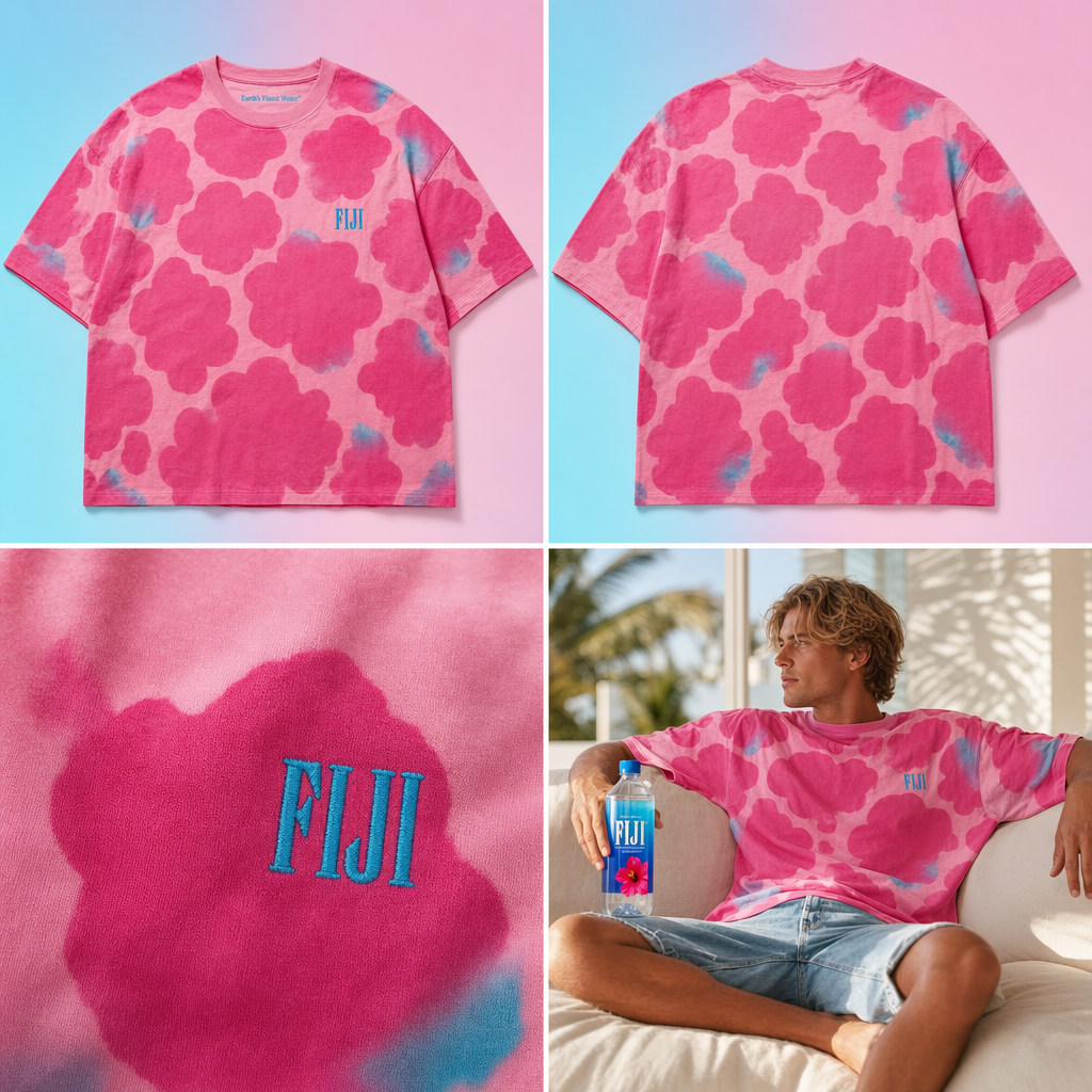 Photorealistic flat-lay and on-body mockups of a unisex premium cotton "Pink Noise Floral Tee" inspired by FIJI Water. Soft washed hibiscus pink base tee, slightly oversized, mid-weight combed cotton with a smooth, luxe handfeel and subtle sheen. All-over front and back pattern of large, organic hot-pink floral blobs that feel like abstract hibiscus petals and sound waves, with soft edges and painterly gradients, some blobs subtly shifting into FIJI bright light blue (#00C1D5) at the edges to introduce the FIJI blue + magenta pairing without overwhelming the pink field. At left chest, a very small, minimal FIJI logo in cyan/light FIJI blue, clean sans serif, either flat screenprint or tiny satin embroidery – it should feel like a quiet signature, not a billboard. No extra text except a discreet inside neck print reading "Earth’s Finest Water®" in matching cyan. Background: clean studio, ice-blue to light-pink gradient backdrop echoing the bottle gradient, soft even daylight from the left, gentle shadows, no harsh contrast. Camera: one front flat-lay perfectly centered, one back flat-lay, one close-up macro of the embroidered logo and fabric texture, and one lifestyle shot on a casually stylish model lounging on a linen sofa near a sunlit window, relaxed and escapist, barefoot, denim shorts, holding a FIJI bottle that introduces deeper FIJI blue accents without stealing focus from the tee.