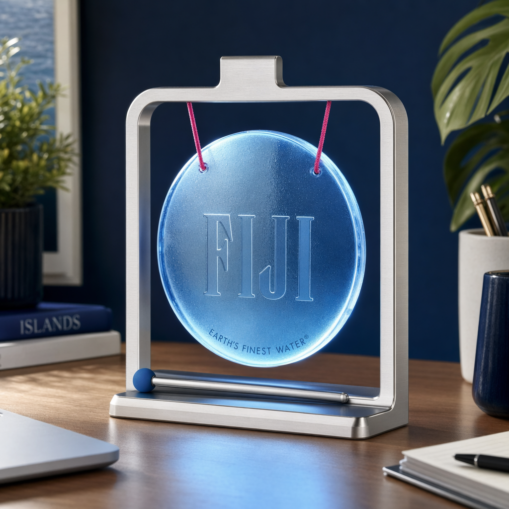 Photorealistic product shot of a minimalist FIJI Water desk gong used as a calming ‘reset’ ritual object. The gong is a precise square frame in brushed aluminum, echoing the iconic FIJI bottle silhouette, with a suspended circular gong disk made from thick, translucent ice-blue acrylic that softly glows from within. The disk carries a subtle etched FIJI wordmark and the campaign line “Earth’s Finest Water®” in small, refined type at the bottom edge. A thin magenta-accent cord suspends the disk, bringing in FIJI’s signature hibiscus pink. The striker is a slim, satin-finished metal rod with a soft silicone tip in FIJI blue, resting in a groove along the base. Surface finish: premium, smooth, no fingerprints, slightly beveled edges; acrylic disk catches the light with gentle refractions like water. Colorway: primary FIJI blue for base details, magenta for cord accent, neutral aluminum body, ice-blue transparent disk with a hint of gradient. Lighting: soft, natural daylight from the left, creating gentle reflections in the acrylic and a faint blue aura on the desk surface; no harsh shadows. Background: clean, softly out-of-focus home workspace with a navy (#041C2C) wall and a hint of tropical greenery, suggesting a well-traveled, laid-back, elevated lifestyle. Camera: straight-on three-quarter view at desk height, medium close-up, shallow depth of field emphasizing material quality and glow. Mood: affordable luxury, personal, calming ritual for starting or ending a work session, playful but quietly confident, no ostentatious elements.