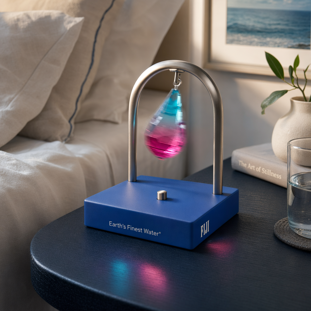 Photorealistic render of a FIJI Water ‘Zen Chime’ bedside alarm object: a compact, sculptural chime that replaces harsh alarms with a soft, physical chime ritual. The base is a solid square block in matte FIJI blue (#003DA5), its proportions subtly nodding to the FIJI bottle footprint. Rising from the base is a slim, curved metal arm in warm brushed stainless, forming an open arch. Suspended at the center of the arch is a small, faceted glass chime inspired by a droplet of water, tinted with a gradient from bright light blue (#00C1D5) at the top to hibiscus magenta (#E10098) at the tip, catching and splitting light like a tiny prism. Discreetly debossed along the front edge of the base: “Earth’s Finest Water®” in small, crisp white type, and a tiny FIJI wordmark on one side. The striker is hidden in the base and gently pops up when ‘ringing’, touching the glass droplet; for the mockup, show the droplet mid-swing with subtle motion blur, as if just chimed by hand. Lighting: warm early-morning window light mixed with cool ambient fill, highlighting the colored refractions from the droplet onto the navy (#041C2C) nightstand surface. Background: soft-focus bedroom scene with linen bedding in light neutrals, a hint of ocean photograph on the wall, emphasizing relaxation and escape, not high-gloss luxury. Camera: slightly above eye level, three-quarter angle showing base, arm, and droplet clearly. Surface finishes: base is ultra-matte and premium, metal arm satin-brushed, droplet polished and reflective like crystal. Mood: intimate, personal, playful ritual for waking gently, emotionally rich but understated, clearly positioned as affordable luxury for everyday use.