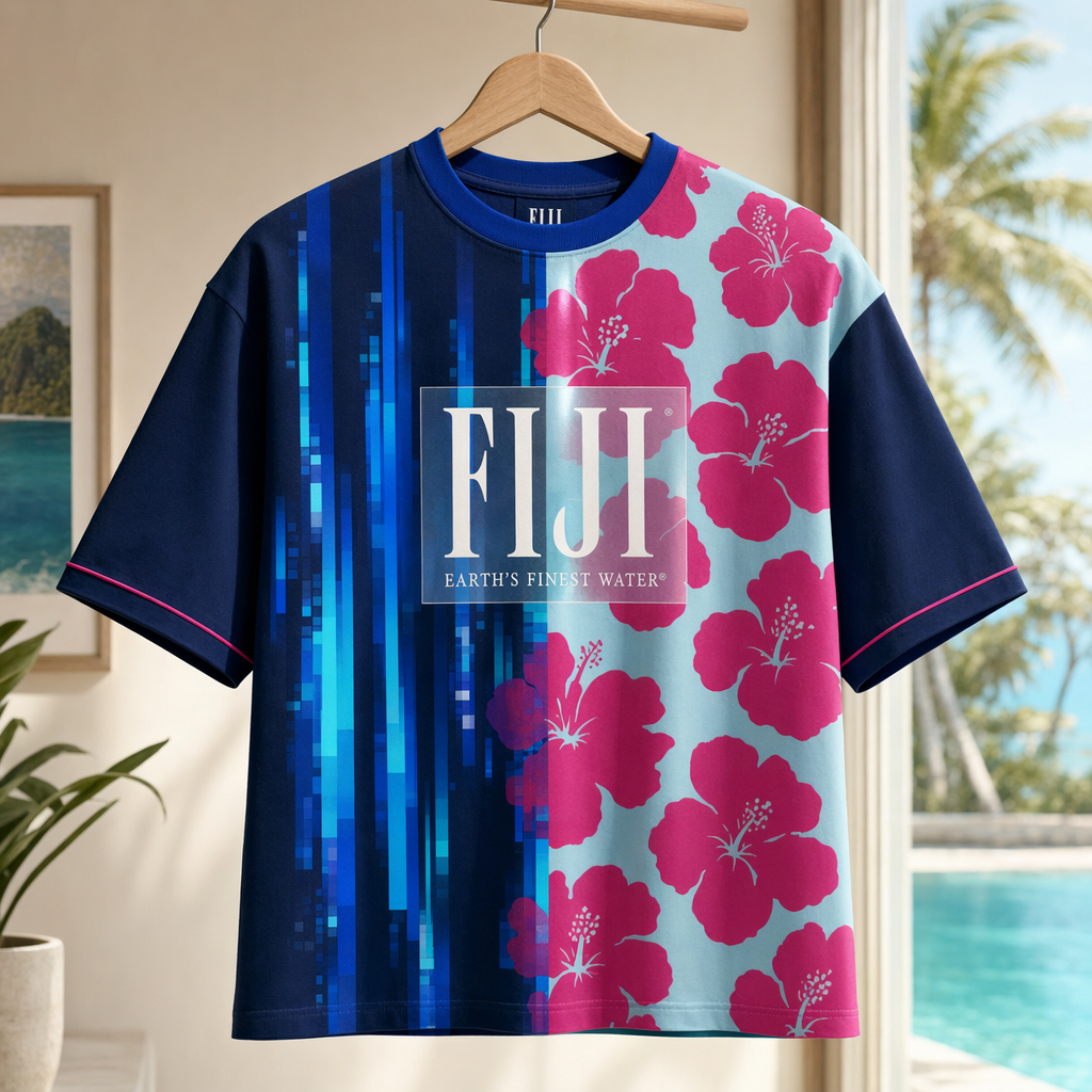 Photorealistic product mockup of a unisex FIJI Water “Split Screen Tee” laid flat on a clean studio surface. Tee is high-quality midweight cotton with a smooth, slightly lustrous finish, relaxed modern fit, crew neck. The body is split perfectly down the vertical center seam: LEFT side in rich FIJI primary blue (#003DA5) with a vertical ‘glitch bars’ pattern inspired by digital signal bars, using layered stripes and blocks in FIJI blues (#003DA5, #005EB8, #00C1D5) with subtle tonal gradients for depth; RIGHT side in vivid hibiscus pink / magenta (#E10098) with an all-over tropical hibiscus print, petals and leaves softly shaded in magenta and lighter pinks, outlined delicately in darker tones, feeling playful but premium, not cheesy. Across the center, bridging the seam, is a clean white FIJI wordmark logo placed at mid-chest, slightly oversized but minimalist, perfectly aligned over the split so it unites both sides. Under the logo in small, refined type: “Earth’s Finest Water®” in white, centered and understated. Neck rib and sleeve hems are neatly constructed in the same body colors per side; stitching is precise and premium. Background is a softly lit gradient from FIJI light blue (#BBDDE6) at the top to deep navy (#041C2C) at the bottom, with faint out-of-focus palm fronds and bokeh light spots suggesting relaxation and escape. Soft studio lighting from top-left creates gentle shadows and highlights on the cotton texture, emphasizing the split design and color vibrancy. Camera angle is a top-down flat lay, framed to show the full tee with a bit of breathing room, no model, no props, focus entirely on the shirt’s split-screen concept, blue + magenta pairing, and the central FIJI branding.