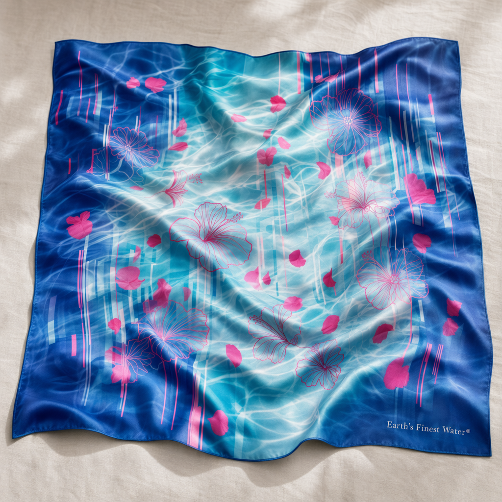 Photorealistic product shot of a FIJI Water-inspired silk scarf laid flat and gently rippled, square format to echo the FIJI bottle. The scarf is made of premium, slightly lustrous silk twill, soft and fluid, photographed from a top-down camera angle. Design concept: a serene, abstract aerial view of a Fijian lagoon. Use FIJI’s core palette: deep FIJI blue (#003DA5) pooling toward the edges, bright light blue (#00C1D5) and soft ice blue (#BBDDE6) flowing through the center like gentle currents, with fine magenta (#E10098) hibiscus petals and line-art hibiscus flowers drifting across the surface. In one corner, a minimal, refined “Earth’s Finest Water®” wordmark in white, small and tasteful, not dominating the art. The pattern feels like ripples and refraction on water, with subtle gradient transitions that mirror the FIJI bottle’s signature blue-to-clear fade. Lighting is soft, diffused daylight from a side angle to emphasize the silk’s delicate sheen and folds without harsh shadows. Background is a neutral, slightly warm off-white linen tabletop, shallow depth of field so the scarf is hero and looks like an affordable, luxe ritual object you’d throw over shoulders after the beach or tie to a tote. No people, no other logos, no sports or high-intensity context; the mood is calm, well-traveled, and relaxed, as if captured in a boutique resort room.