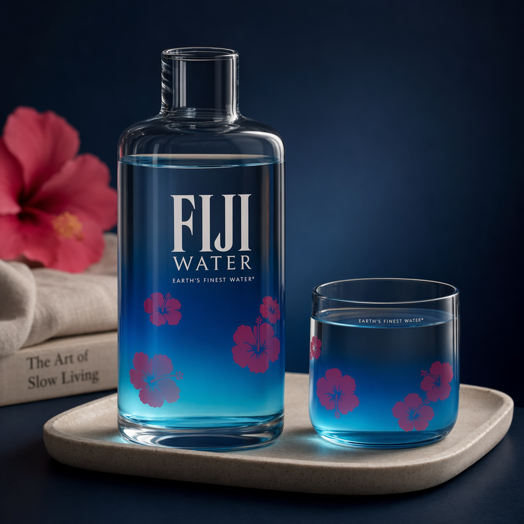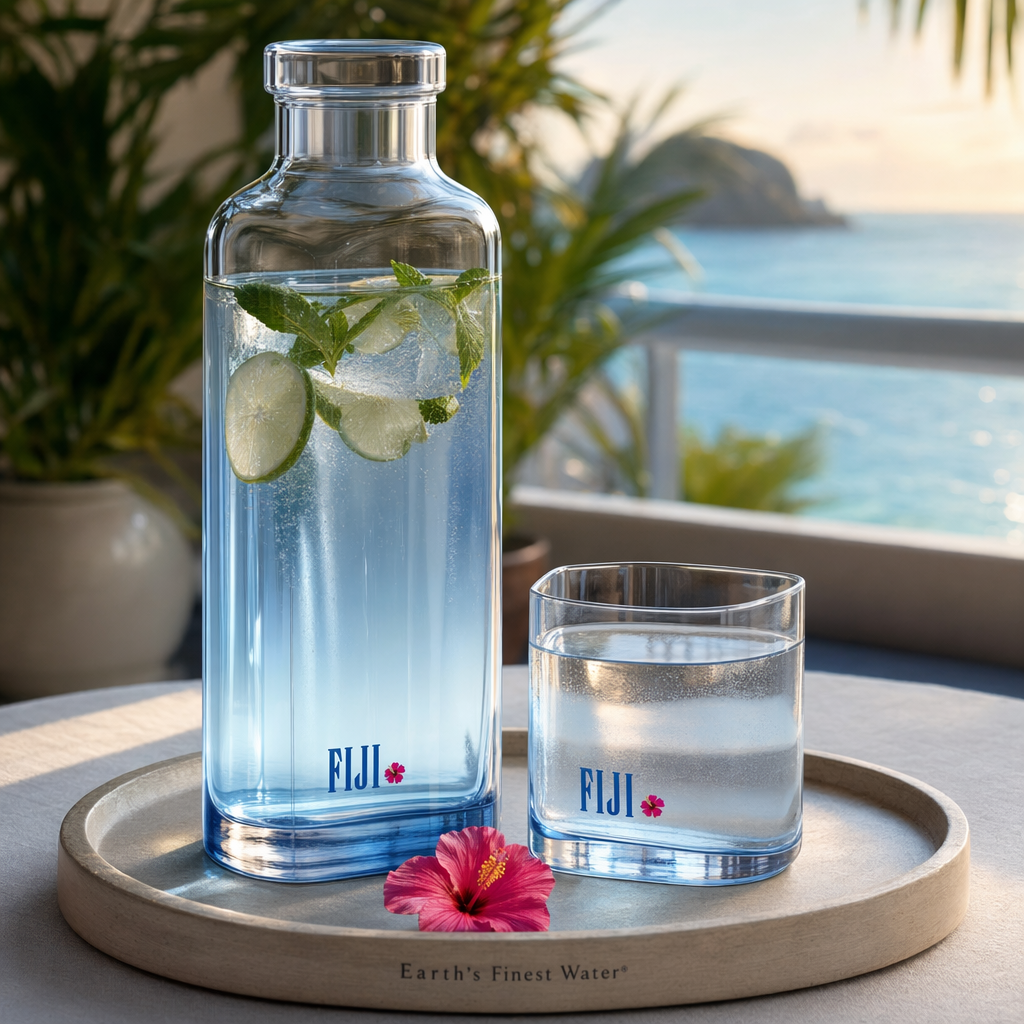 Photorealistic product shot of a FIJI Water-inspired, ultra-premium but accessible glass carafe and tumbler set for an everyday hydration ritual. The carafe is tall and subtly squared in profile, echoing the iconic FIJI bottle silhouette, with softly rounded corners. Crystal-clear borosilicate glass, thin yet sturdy, with a smooth, seamless finish and a slightly weighted base. A minimal FIJI logo in primary FIJI blue (#003DA5) is etched near the base, with a small hibiscus icon in magenta (#E10098) as a delicate accent, not loud branding. The matching tumbler is low, wide, and also subtly square with rounded edges, designed to feel relaxed and easy in the hand. The carafe is filled with water and a few thin slices of lime and fresh mint, suggesting wellness and everyday ritual. A soft ombré light plays across the glass, shifting from FIJI blue to light ice-blue (#BBDDE6) with subtle reflections reminiscent of tropical water. Background: out-of-focus, relaxed balcony or lanai scene suggesting a coastal or island setting, with soft afternoon natural light, a hint of palm leaves and ocean horizon bokeh, but no people. Color palette: navy (#041C2C) shadows, FIJI blues, and a small hit of magenta from a single hibiscus petal resting on the tray near the glass. Camera: 3/4 angle, slightly above eye level, tight framing on the set placed on a light wood or stone tray on a linen-covered table. Lighting: soft, diffused, golden-hour side light with gentle highlights and no harsh reflections, emphasizing clarity, calm, and “liquid luxury” without ostentation. Include the tagline discreetly on the tray edge or glass in tiny, tasteful text: “Earth’s Finest Water®”.